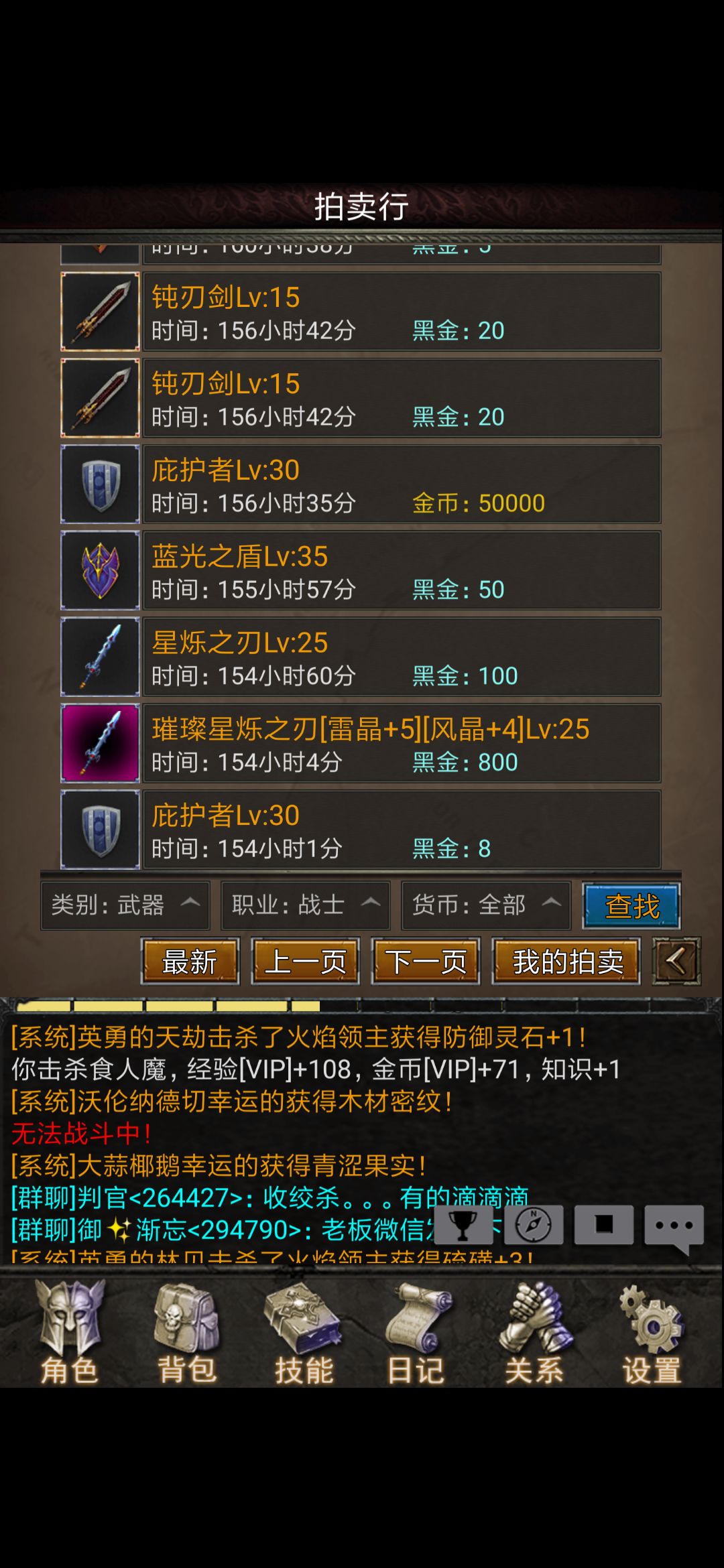 武器:10级魔法武器——>15级遗迹武器——>20级任务武器——>25级魔法武器,(除了任务送的武器)都可以在拍卖行买到,很便宜,根据自己需要更换,比如买一把15武器和25武器,直接跳过10级武器、20级武器也是可以滴(下图中的25级武器便宜的只要十万金币或者10黑金)