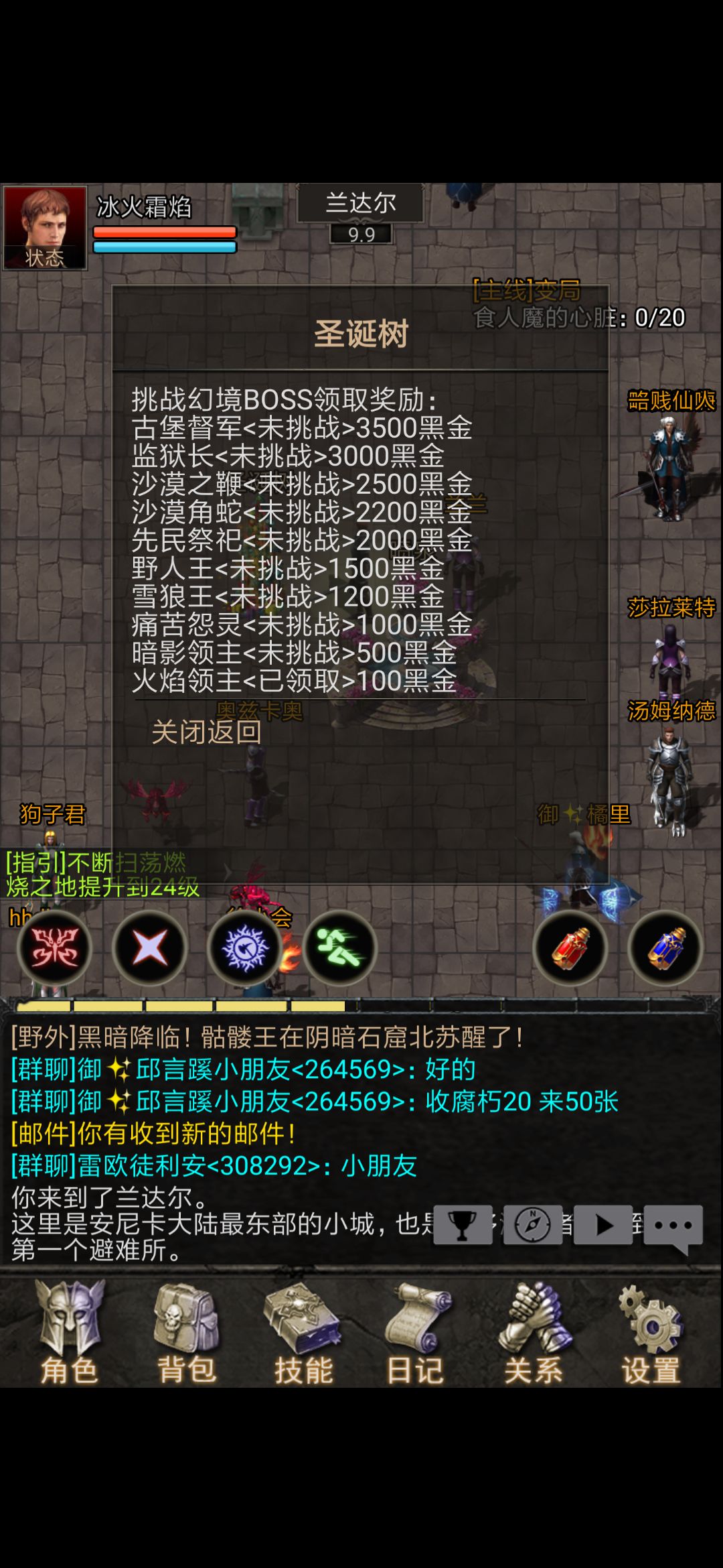 2,高级幻境boss首杀奖励,如下图(在圣诞树那里领取,每个boss每个玩家只能领一次奖励)