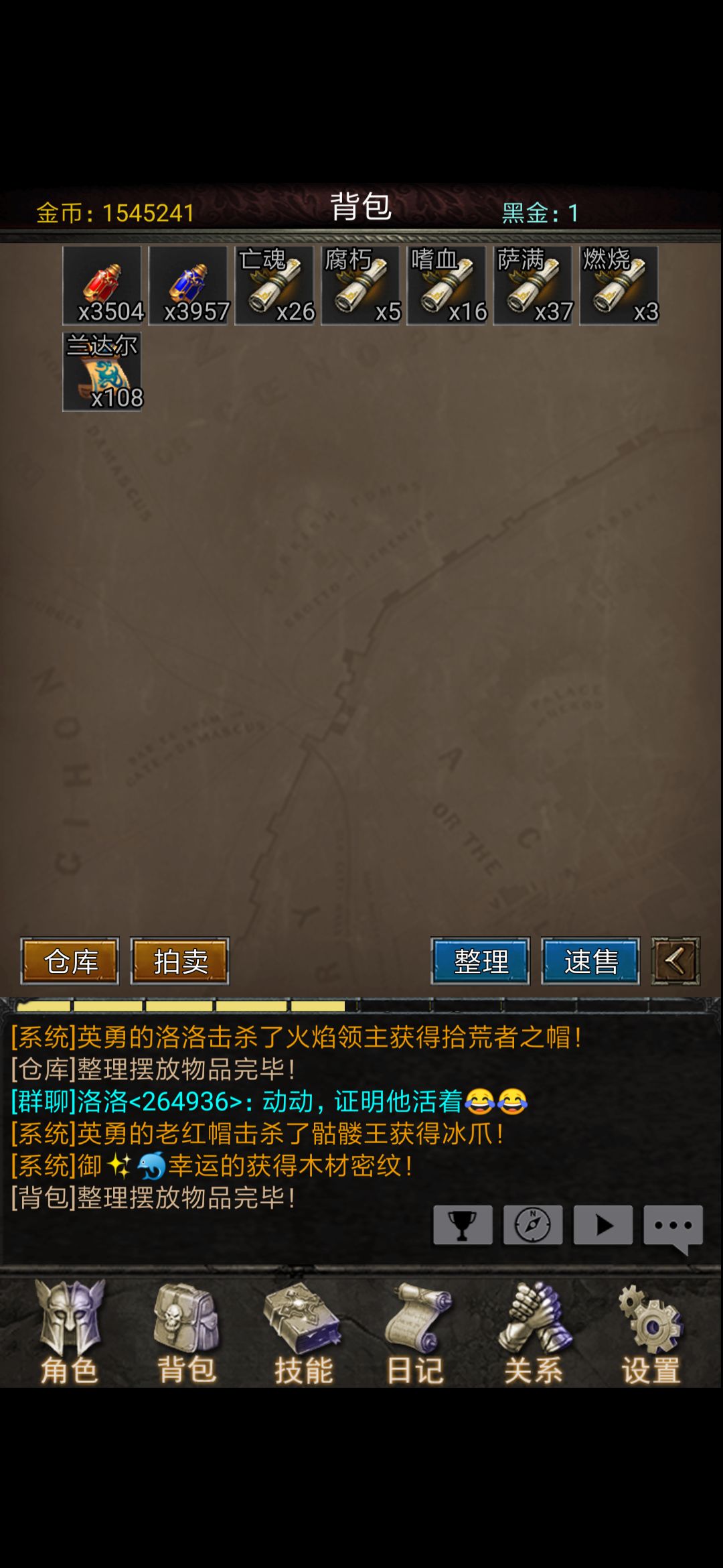 (3)把背包中除了红蓝药水、回城卷、副本门票外的所有东西存进仓库(背包中自带仓库、拍卖行功能),如下图
