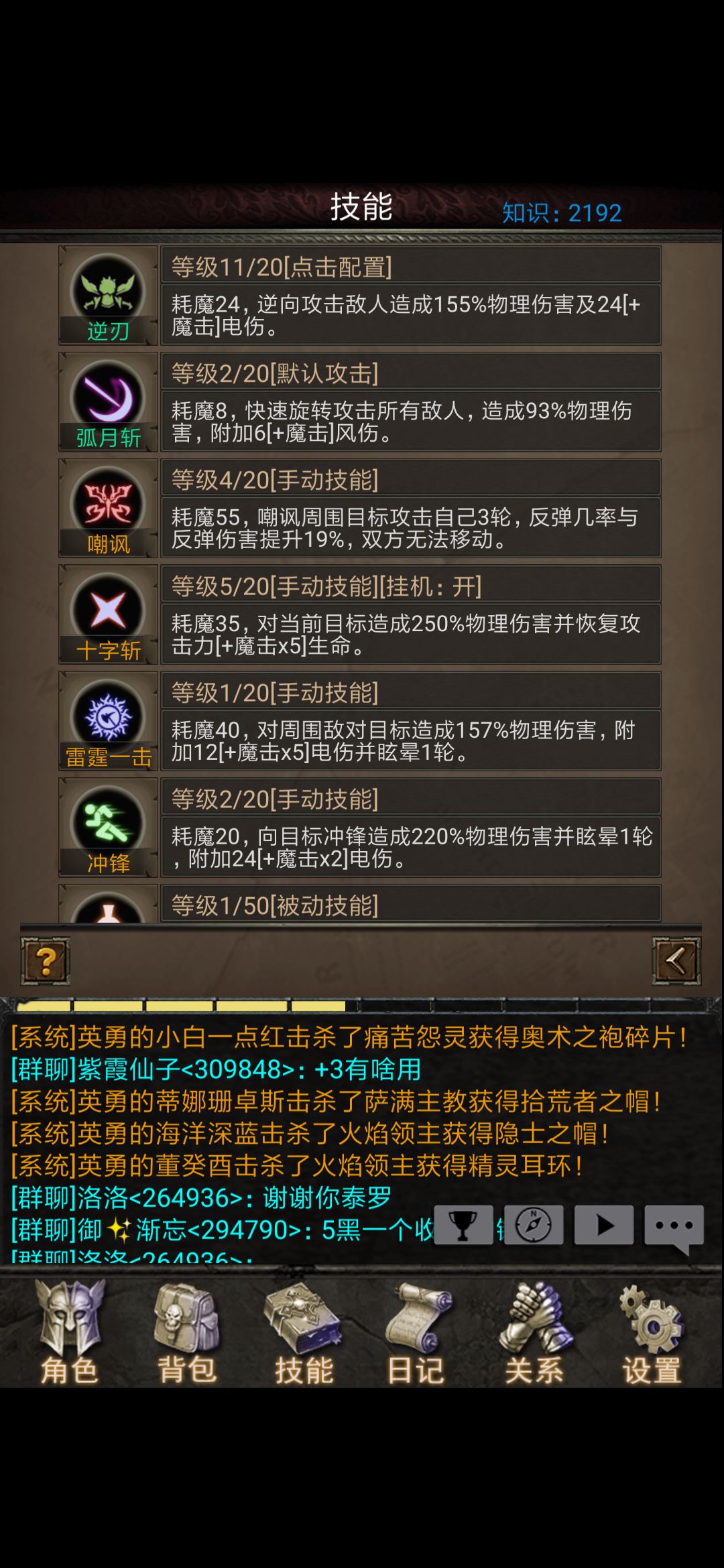 (5)选择合适的地图和技能,这个非常重要,具体要根据实际情况调整,比如我昨晚19级,去挂24级妖鬼,用群攻自己容易死,只能用单体技能打,刷了一会上线一看,经验没涨多少,血药蓝药却费的很快,后来改变思路去刷15级牛头怪,用群攻技能(级别低、魔耗少)刷的很快,效率比刷妖鬼高多了,血蓝药消耗也非常少
