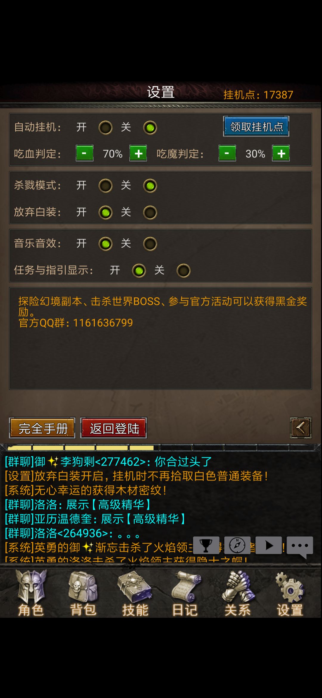 新手送十五天vip,每天在设置中领取下挂机点数,就可以愉快的挂机啦(/ω\)