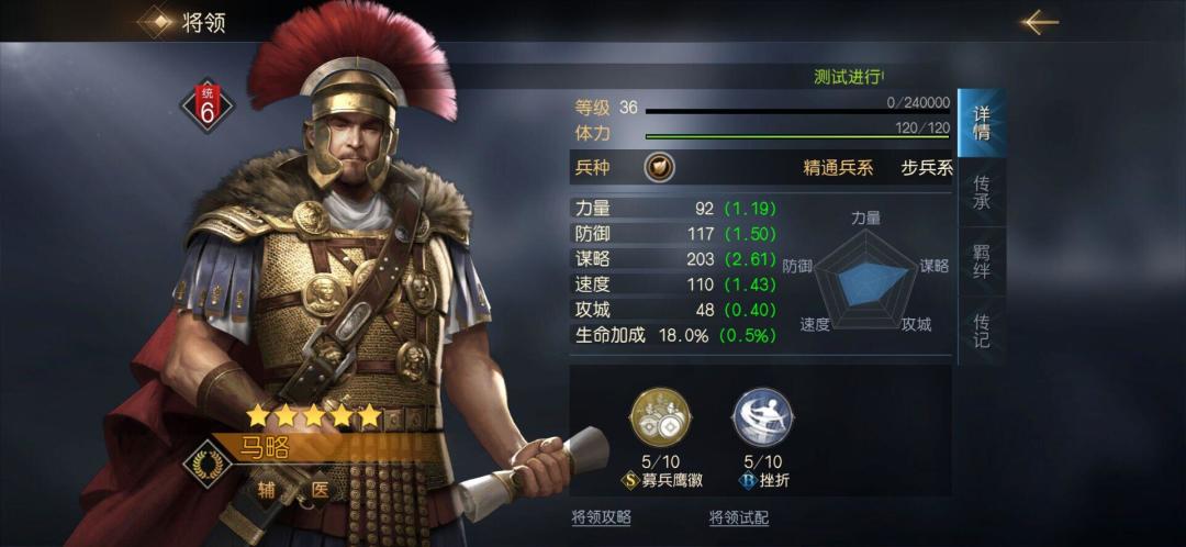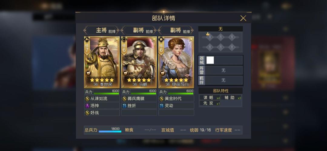 7级野地的将领配置豪华许多,为3+2+2的技能搭配,并且有四个S级的技能,发动起来威力挺大的。总的统御值也达到了19。因此为了保险起见,我从多个维度提升我的部队战斗力,以提高胜算,虽然说失败的可能性也很大,但是火中取栗这种事情也不是第一次做了。