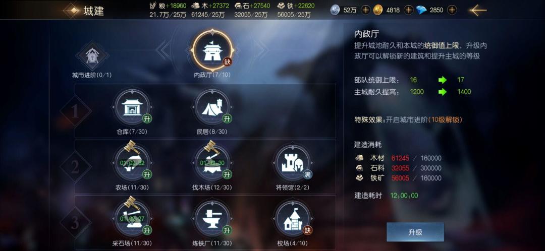 首先我就提升内政厅等级,将部队的统御值上限提升,这样子就可以搭配三个橙色将领了,在阵容上还根据弓兵克制步兵的兵种克制关系,搭配了对应的将领,并且提升了弓兵的技能,这是一处优势。而后是直接提高带兵数量,在内政厅那里把兵营等级升到了7级,带兵数量大幅度提高,加上我辛苦练级的将领,带兵数量达到了一万五六的样子,基本上持平了数量,虽然还是有劣势。