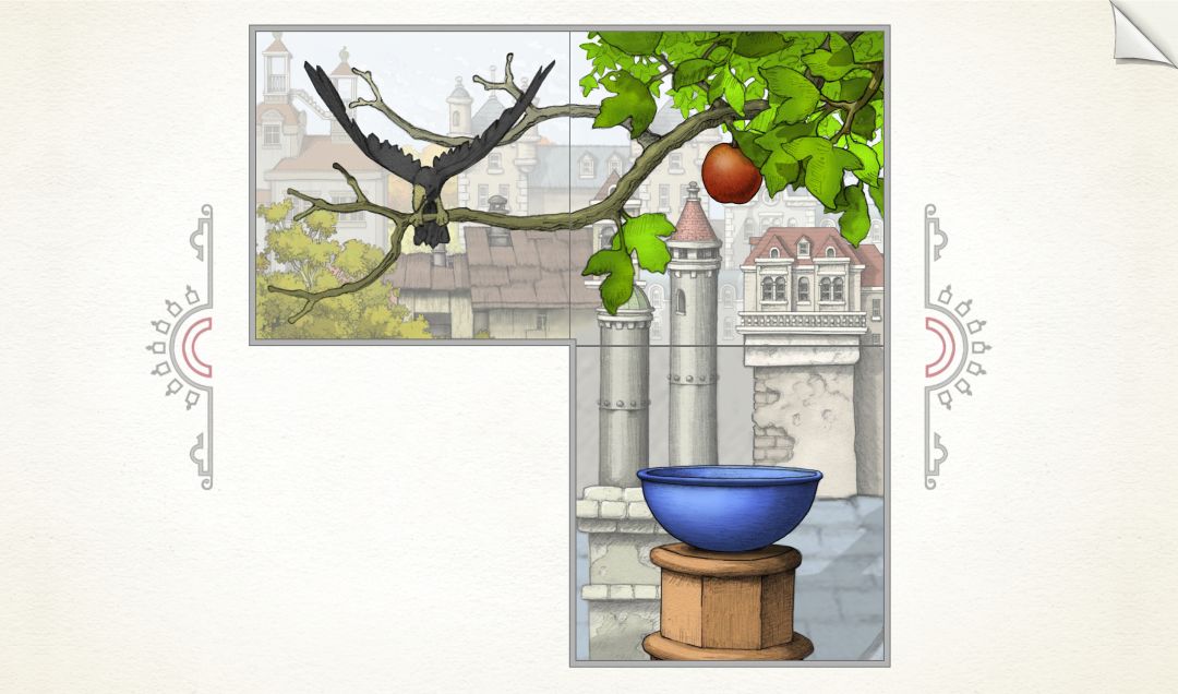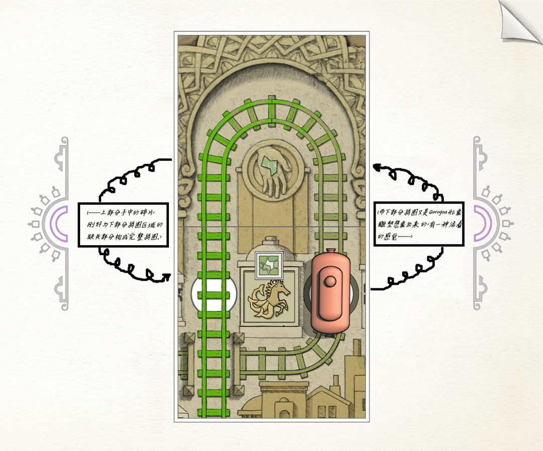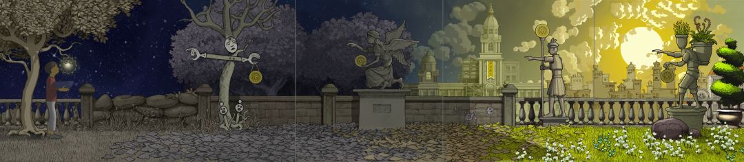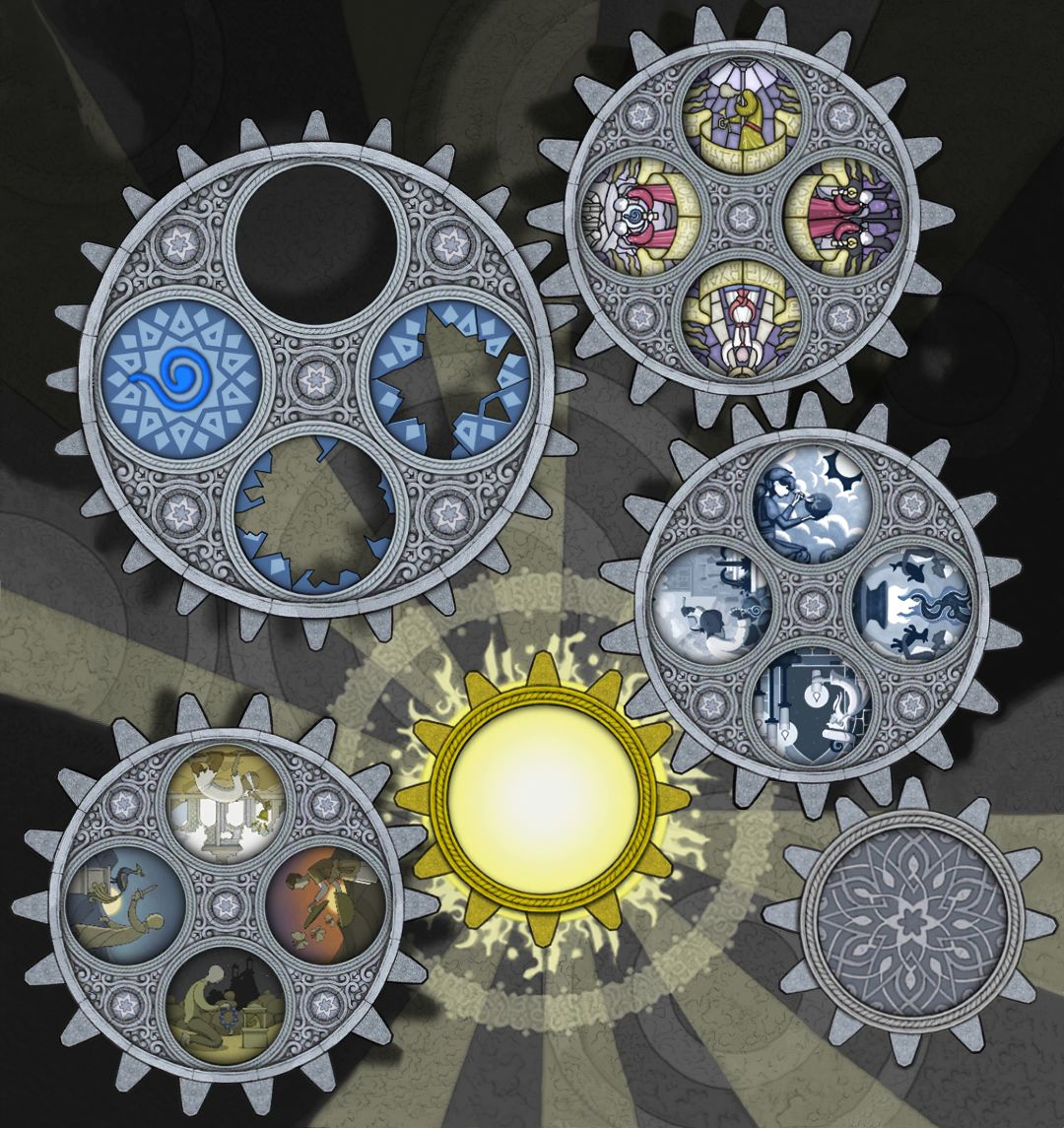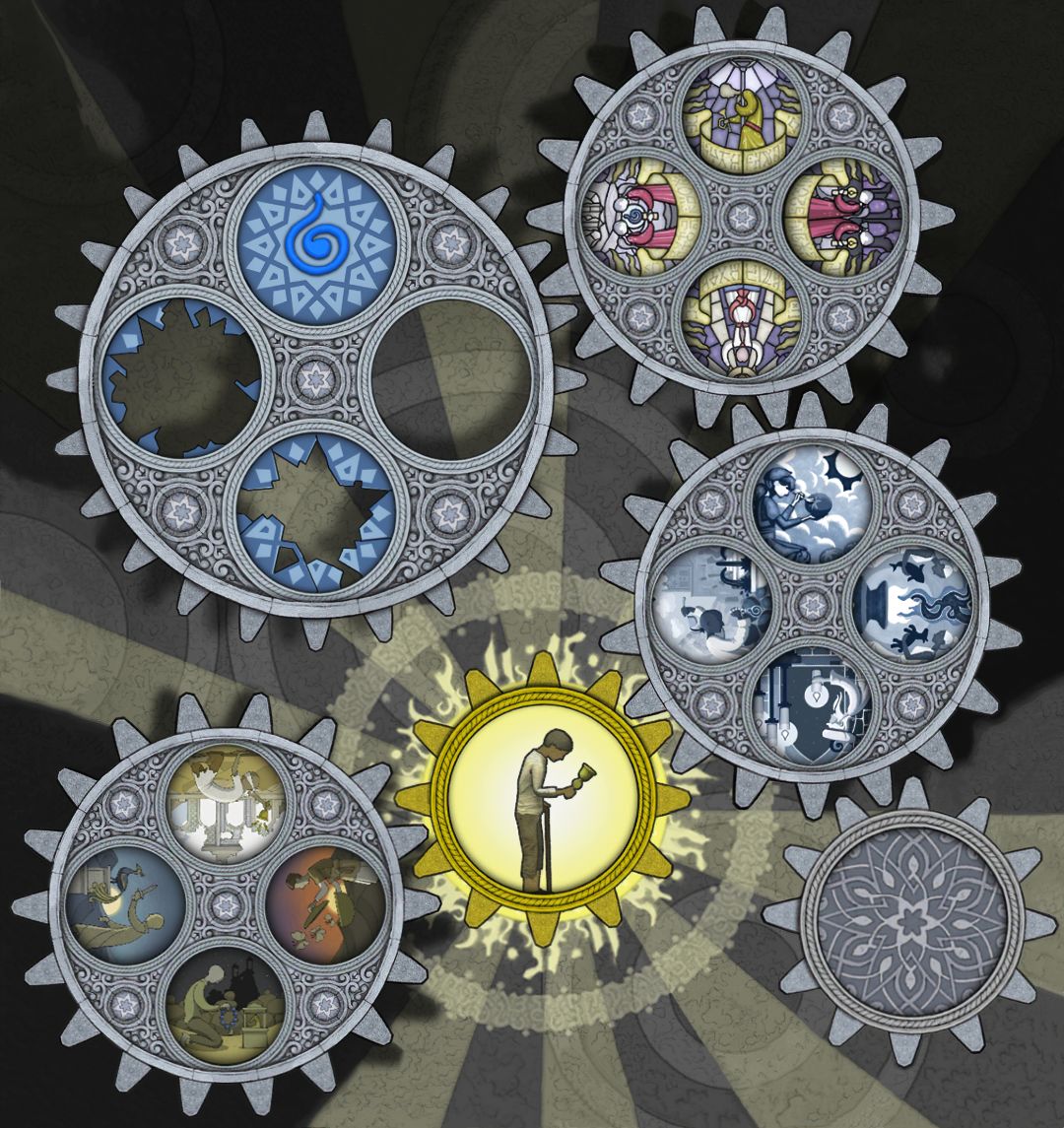 ———在此说明一下:为何转完一圈后,为何其他齿轮里的场景没有变动?主角走完11步后,大齿轮里的场景旋转了270°(在常规情况下!小齿轮里的场景是不可能返回原位的。)但是作者设计的各个齿轮的齿槽太绝啦!【大齿轮的270°=小齿轮的360°,看懂了吗】所以看起来其他齿轮里场景没有变化。并不是我偷懒。(*╹▽╹*)!———