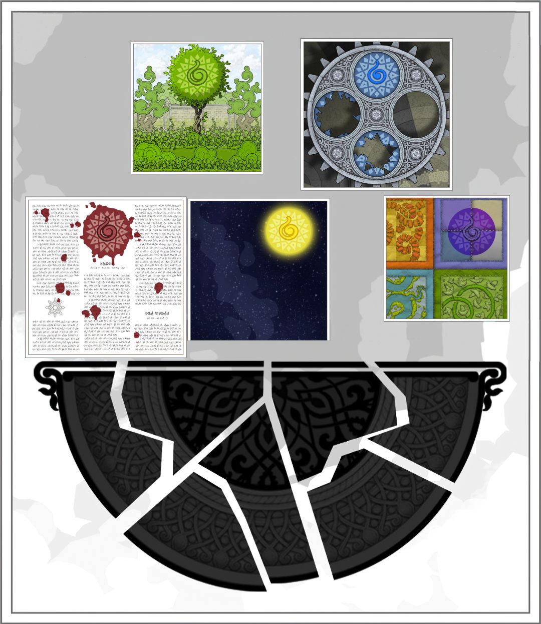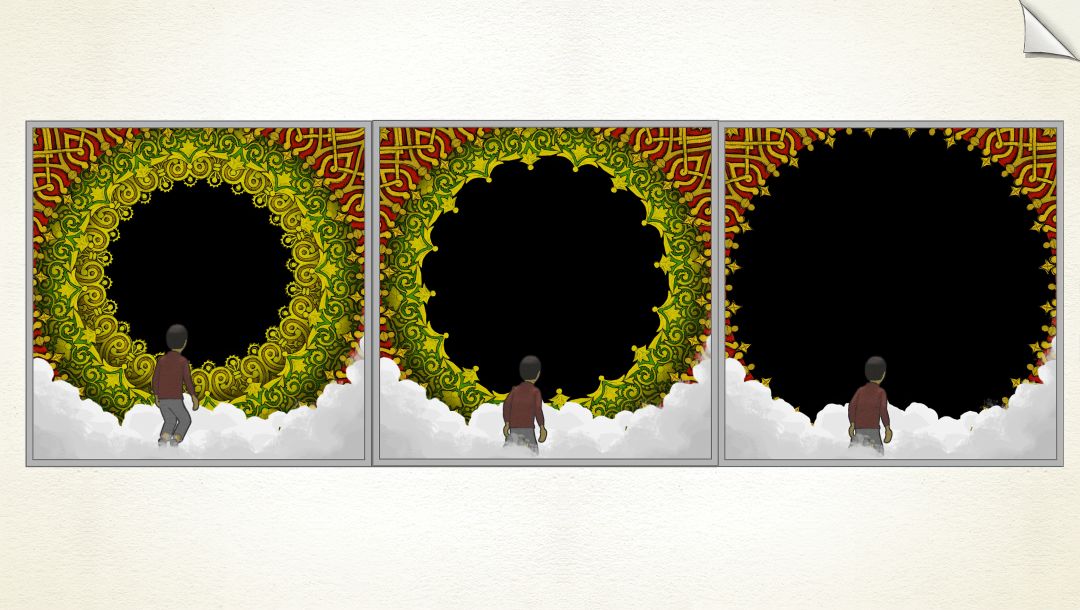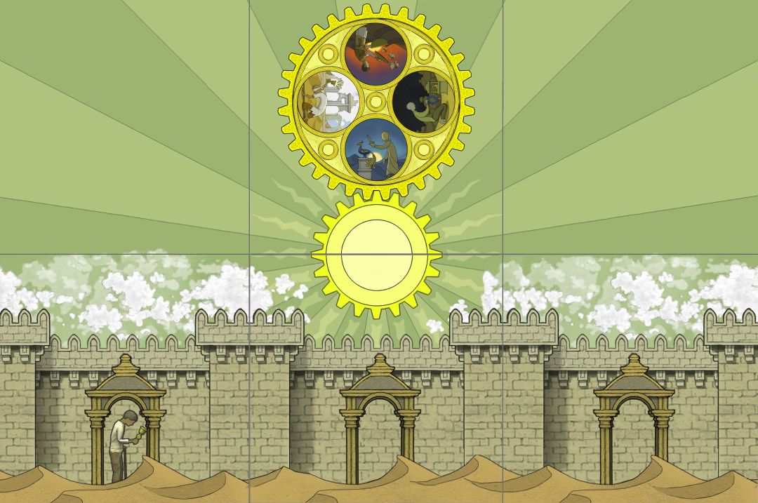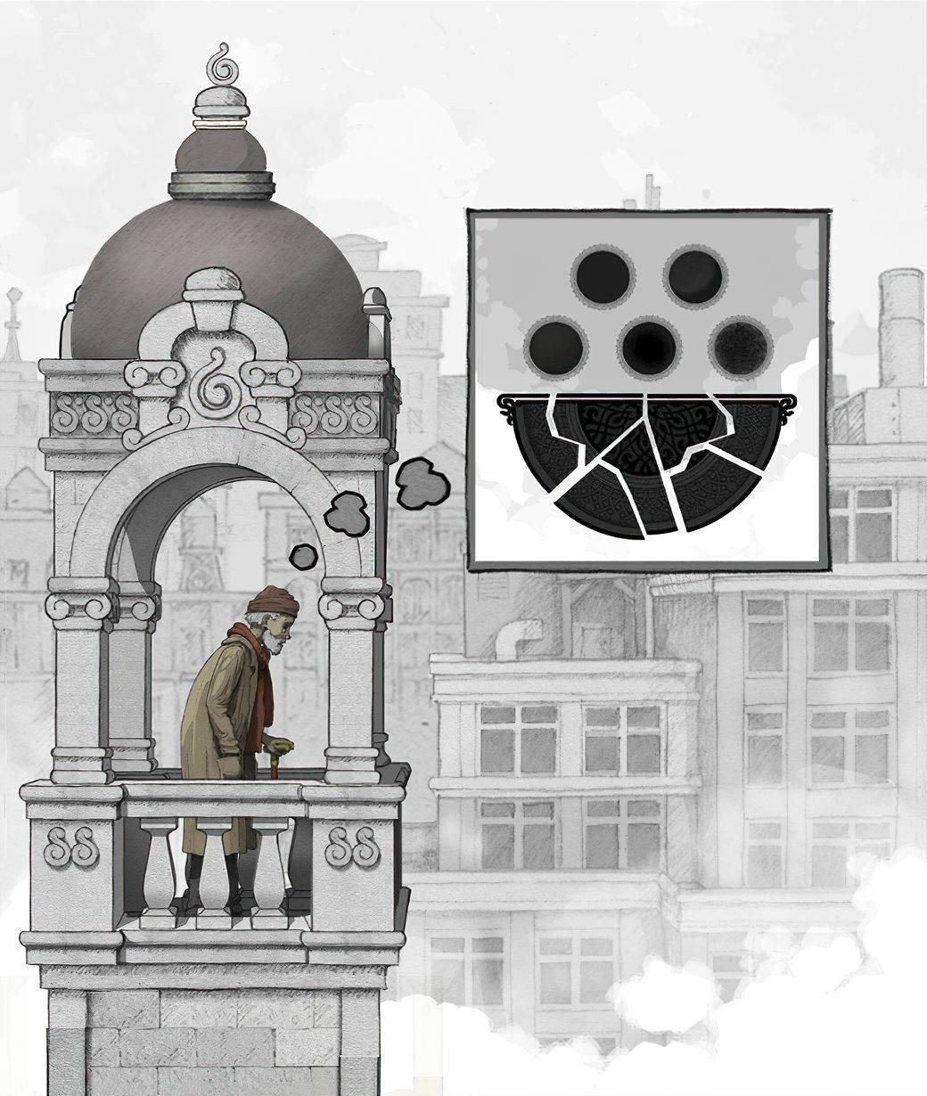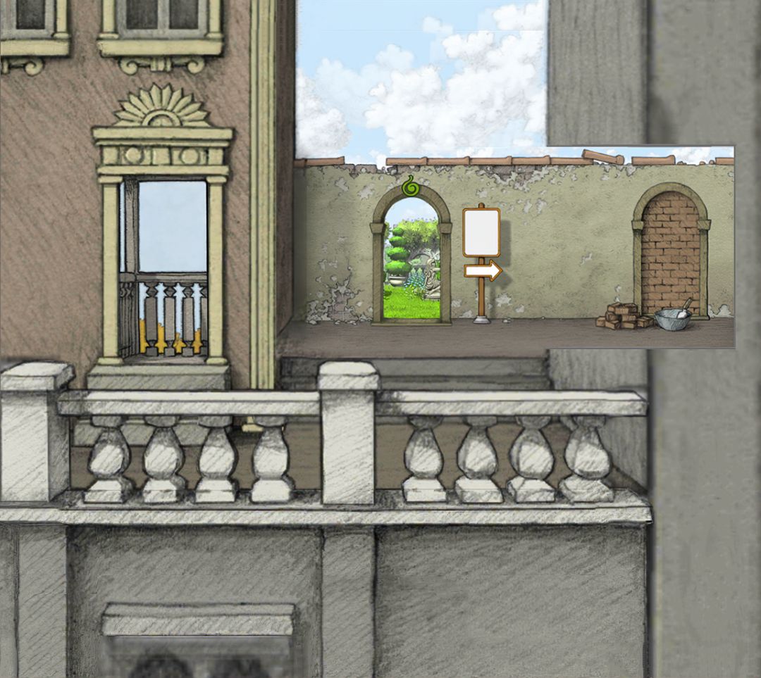 ———在此说明一下:为何转完一圈后,为何其他齿轮里的场景没有变动?主角走完11步后,大齿轮里的场景旋转了270°(在常规情况下!小齿轮里的场景是不可能返回原位的。)但是作者设计的各个齿轮的齿槽太绝啦!【大齿轮的270°=小齿轮的360°,看懂了吗】所以看起来其他齿轮里场景没有变化。并不是我偷懒。(*╹▽╹*)!———