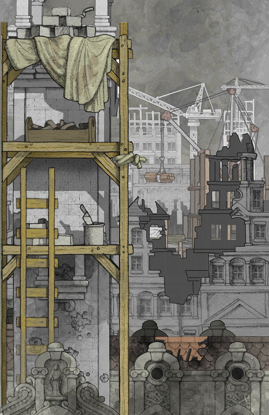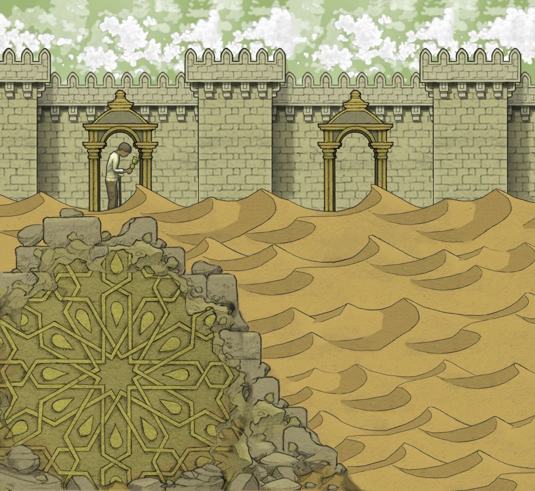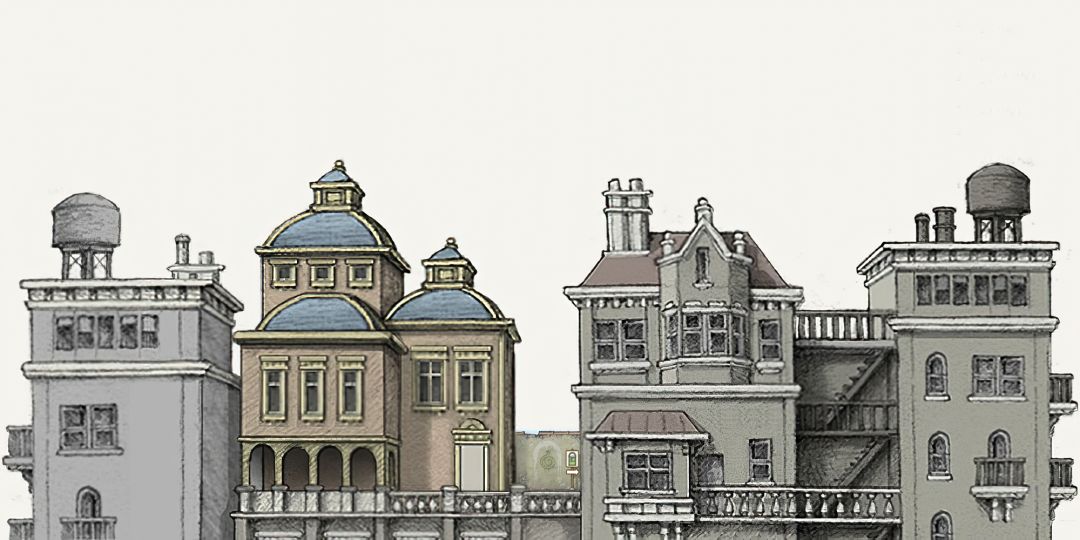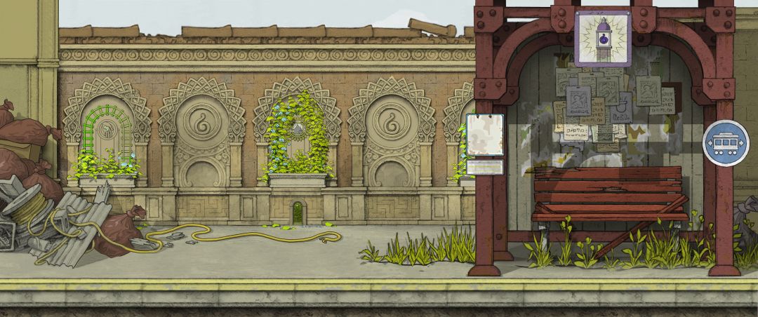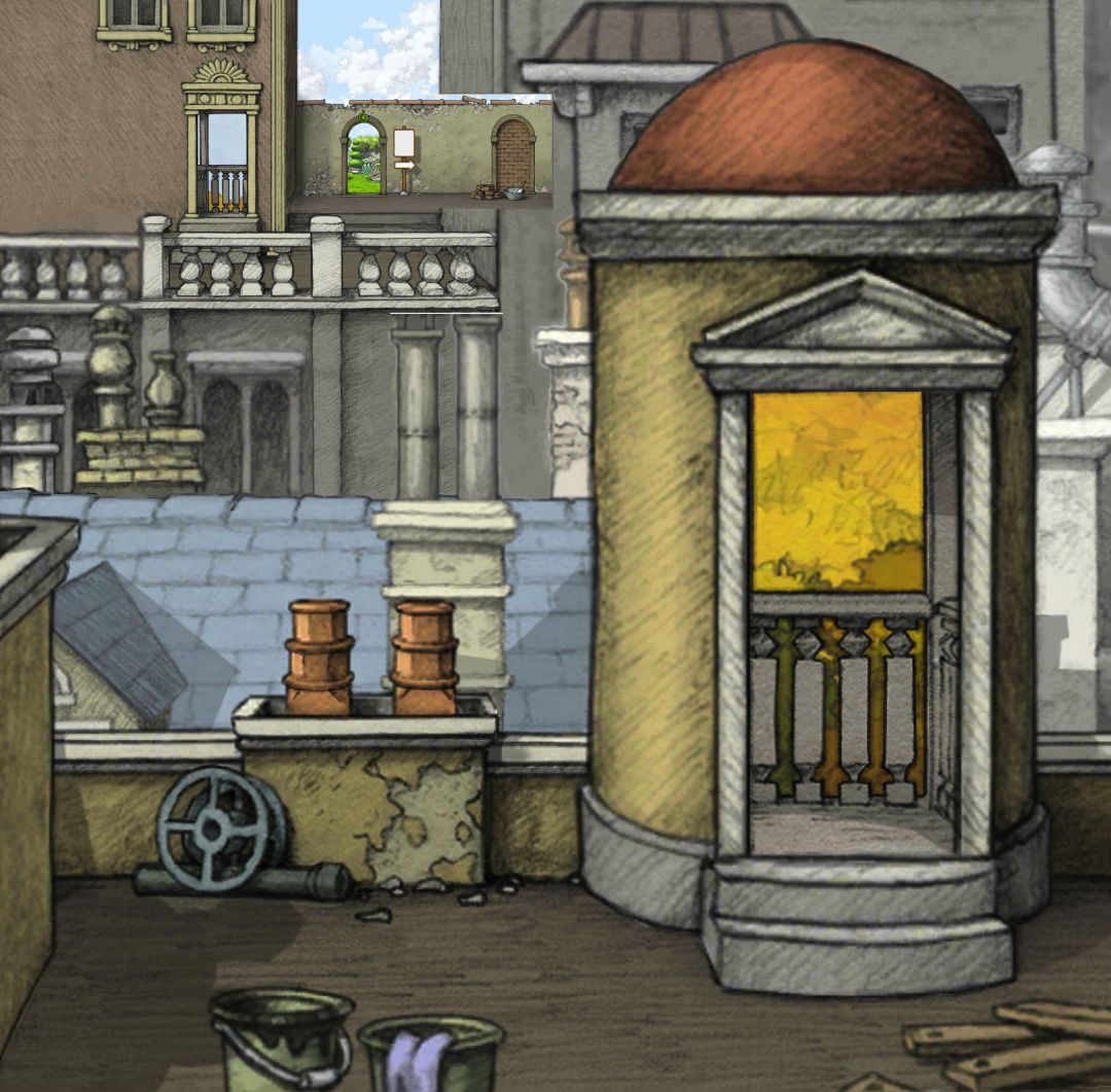 【线以左部分对应剧情场景时间线是:主角青年时期后期,正在修护的博物馆!所以有类似摧毁的痕迹】