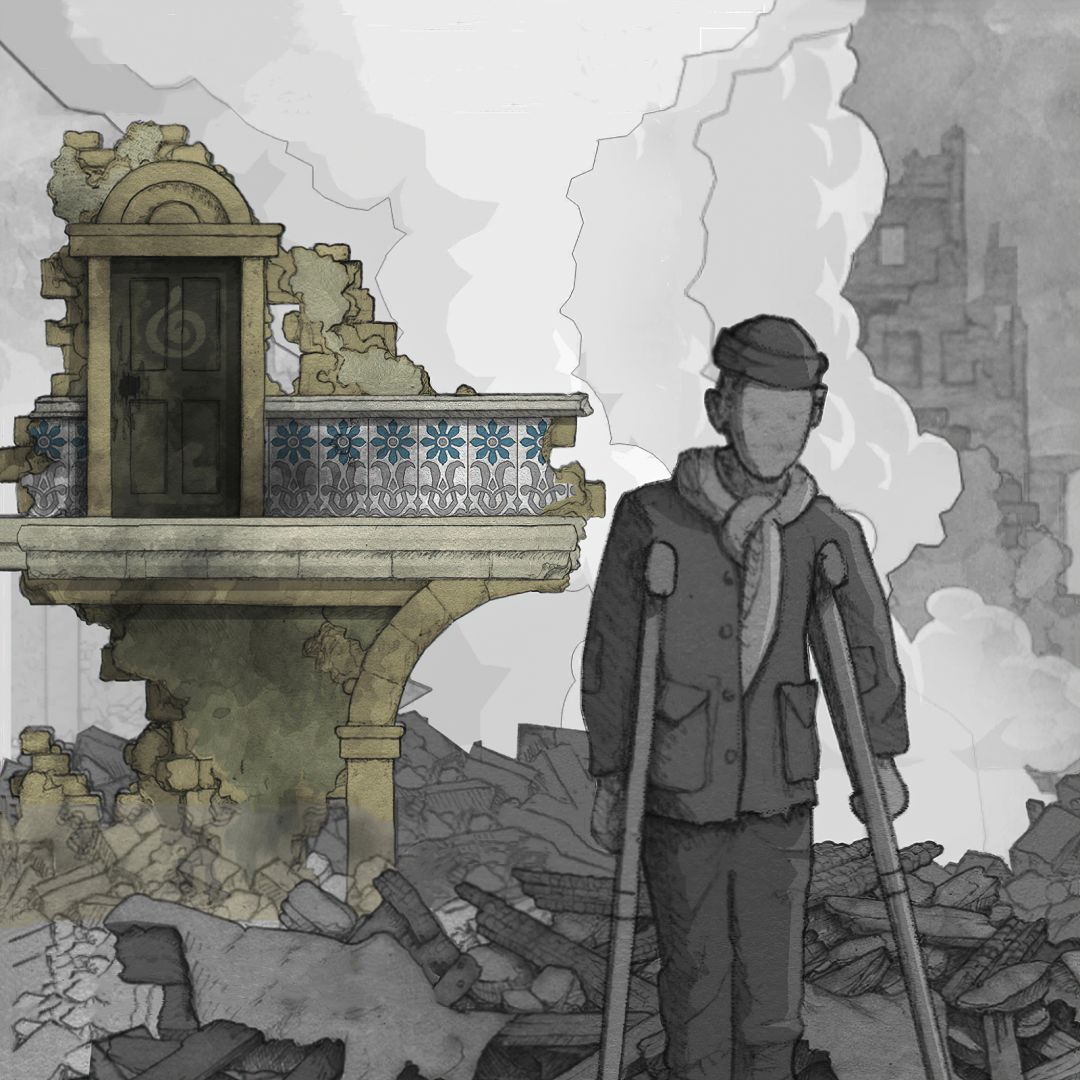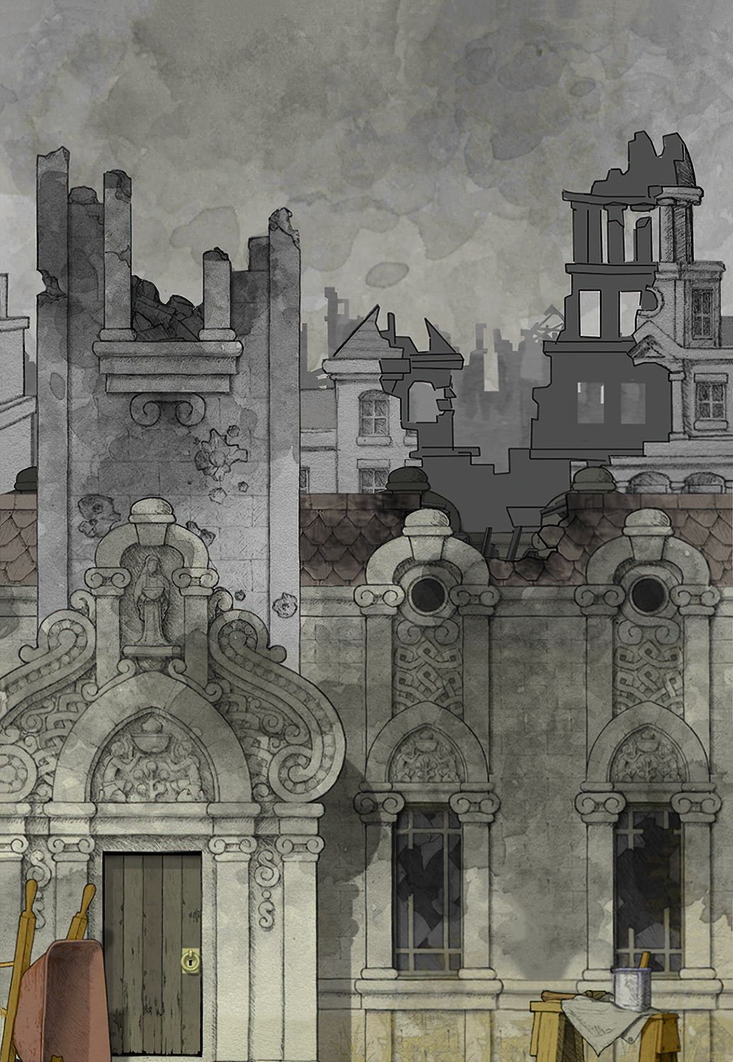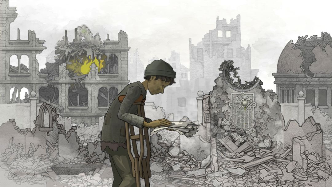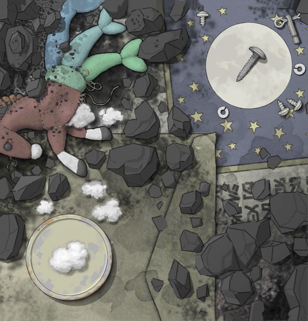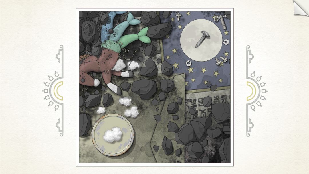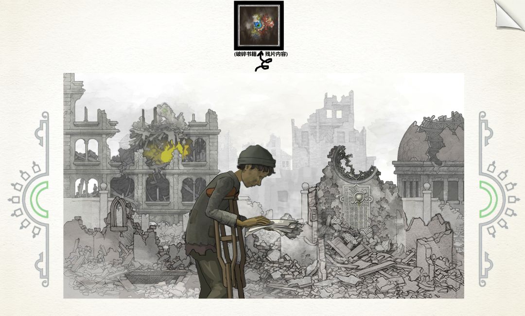 【对应剧情场景是:主角少年时期,城市被陨石摧毁.原本的家变为废墟场景,包括拿在手中的破碎书籍也是在此附近找到(可以看到童年时期玩具形象,之后带回了陨石在这时期居住的房间内研究)】