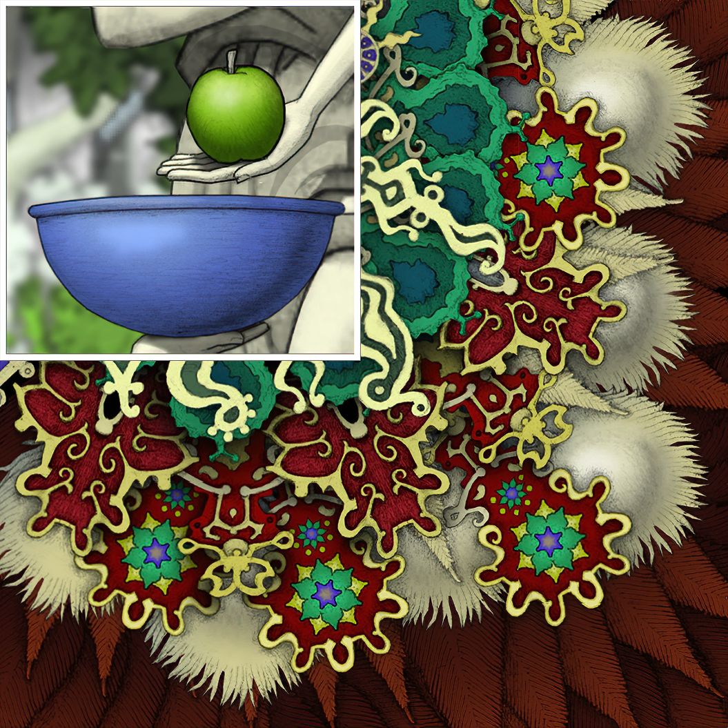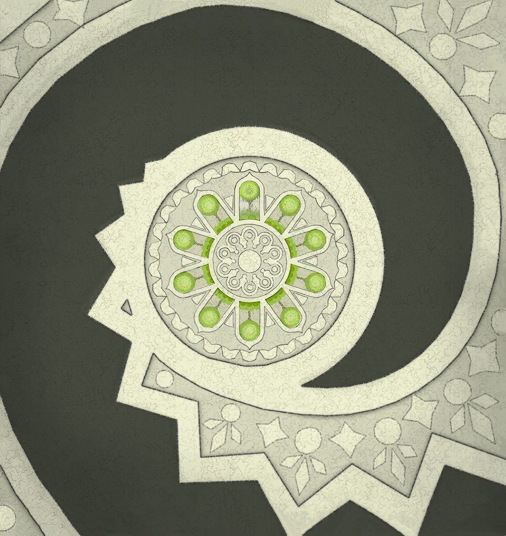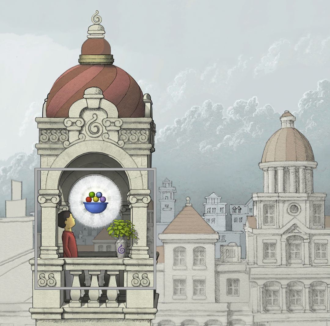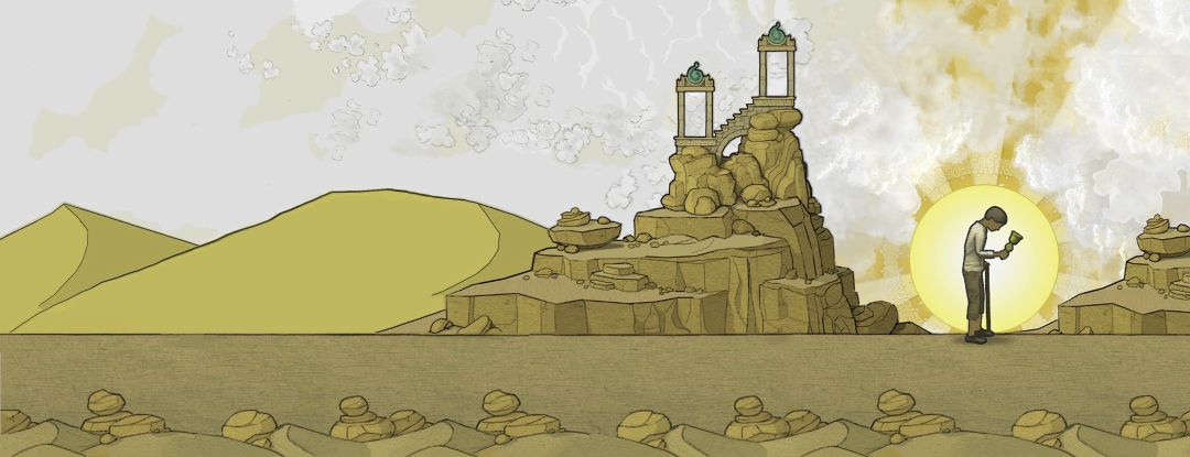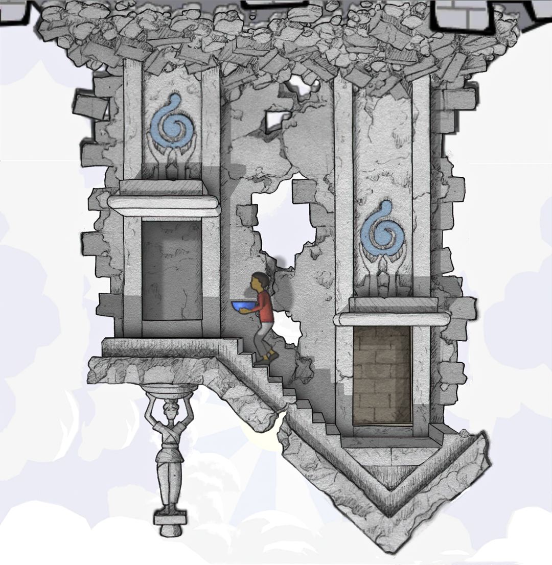 【注意:此图中有两个GOROGOA,所以不要以为是主角为了看见GOROGOA才召唤和追寻的!童年主角由于好奇心驱使下,去追寻在窗外看见的奇异生物!之后成功通过简单地穿越各种传送门,走一些台阶和爬一些楼梯,最后集齐五色果实。成功召唤了GOROGOA,但是这些果实并不是通过自身努力获取的。自然就没有得到GOROGOA的认可!之后童年主角付出了腿瘸的代价,犹如预言书的类容一样:一条腿被链子缠住。然而主角并不知道,他这一举动给城市带来了灾难。随着时间推移!慢慢成熟的主角在翻阅各种书籍,通过自身的不断努力去尝试,去实践,去弥补自己造成的结果。于是就有了中年时期主角为了弥补自身过错,参加各种宗教的朝圣活动!为的是清除自身的污垢和过错。所以牺牲和奉献主题的表达跨越时间最长!步入了老年时期,主角终于悟出其中道理!再次踏上旅途,然而这次旅途并不是好奇心驱使。而是成就自我成为GOROGOA!】