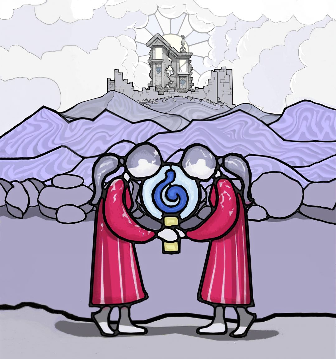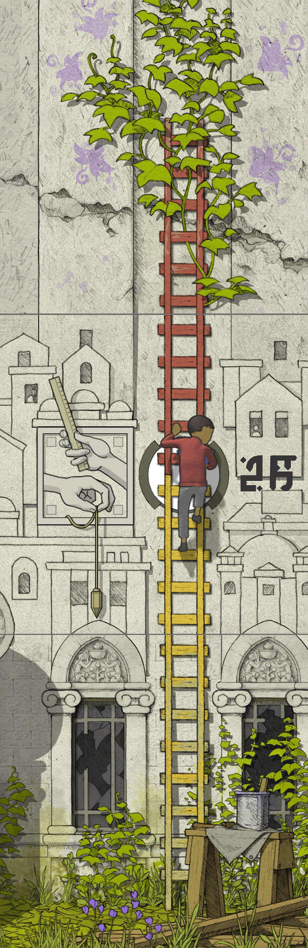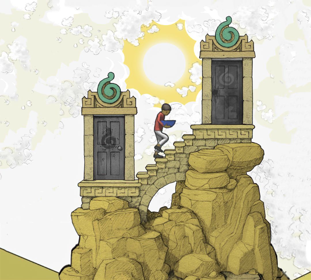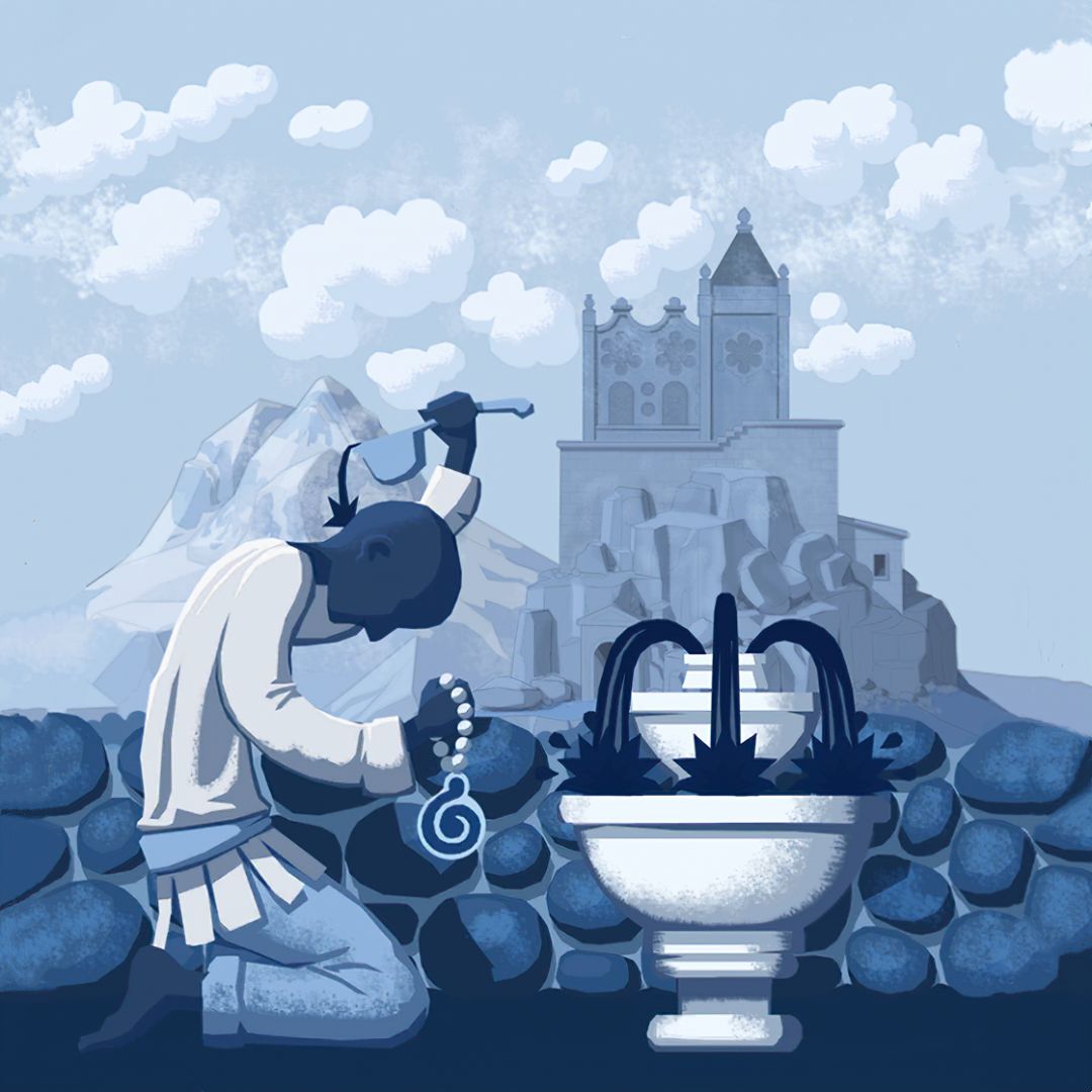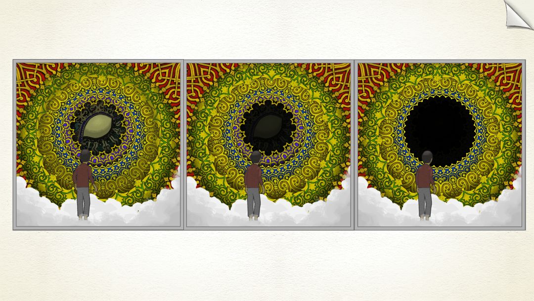 【注意:此图中有两个GOROGOA,所以不要以为是主角为了看见GOROGOA才召唤和追寻的!童年主角由于好奇心驱使下,去追寻在窗外看见的奇异生物!之后成功通过简单地穿越各种传送门,走一些台阶和爬一些楼梯,最后集齐五色果实。成功召唤了GOROGOA,但是这些果实并不是通过自身努力获取的。自然就没有得到GOROGOA的认可!之后童年主角付出了腿瘸的代价,犹如预言书的类容一样:一条腿被链子缠住。然而主角并不知道,他这一举动给城市带来了灾难。随着时间推移!慢慢成熟的主角在翻阅各种书籍,通过自身的不断努力去尝试,去实践,去弥补自己造成的结果。于是就有了中年时期主角为了弥补自身过错,参加各种宗教的朝圣活动!为的是清除自身的污垢和过错。所以牺牲和奉献主题的表达跨越时间最长!步入了老年时期,主角终于悟出其中道理!再次踏上旅途,然而这次旅途并不是好奇心驱使。而是成就自我成为GOROGOA!】