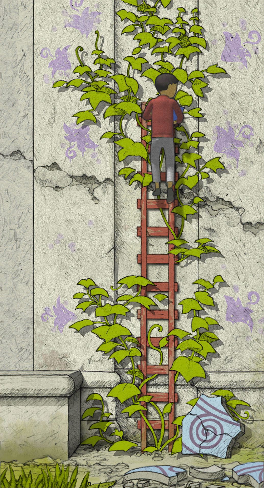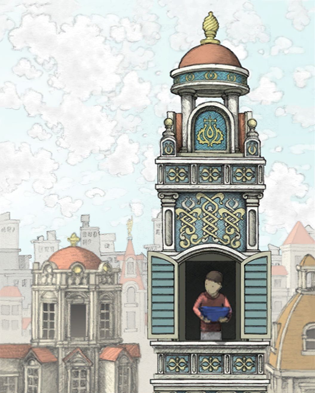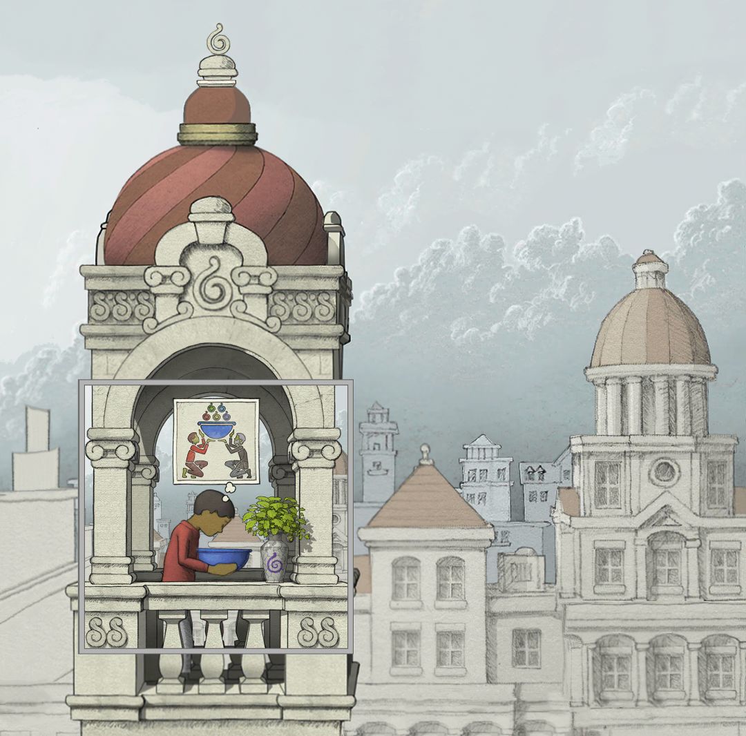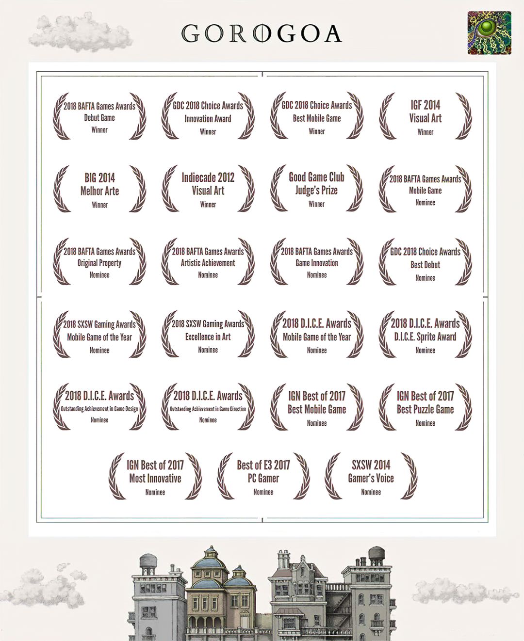 【注意:此图中有两个GOROGOA,所以不要以为是主角为了看见GOROGOA才召唤和追寻的!童年主角由于好奇心驱使下,去追寻在窗外看见的奇异生物!之后成功通过简单地穿越各种传送门,走一些台阶和爬一些楼梯,最后集齐五色果实。成功召唤了GOROGOA,但是这些果实并不是通过自身努力获取的。自然就没有得到GOROGOA的认可!之后童年主角付出了腿瘸的代价,犹如预言书的类容一样:一条腿被链子缠住。然而主角并不知道,他这一举动给城市带来了灾难。随着时间推移!慢慢成熟的主角在翻阅各种书籍,通过自身的不断努力去尝试,去实践,去弥补自己造成的结果。于是就有了中年时期主角为了弥补自身过错,参加各种宗教的朝圣活动!为的是清除自身的污垢和过错。所以牺牲和奉献主题的表达跨越时间最长!步入了老年时期,主角终于悟出其中道理!再次踏上旅途,然而这次旅途并不是好奇心驱使。而是成就自我成为GOROGOA!】