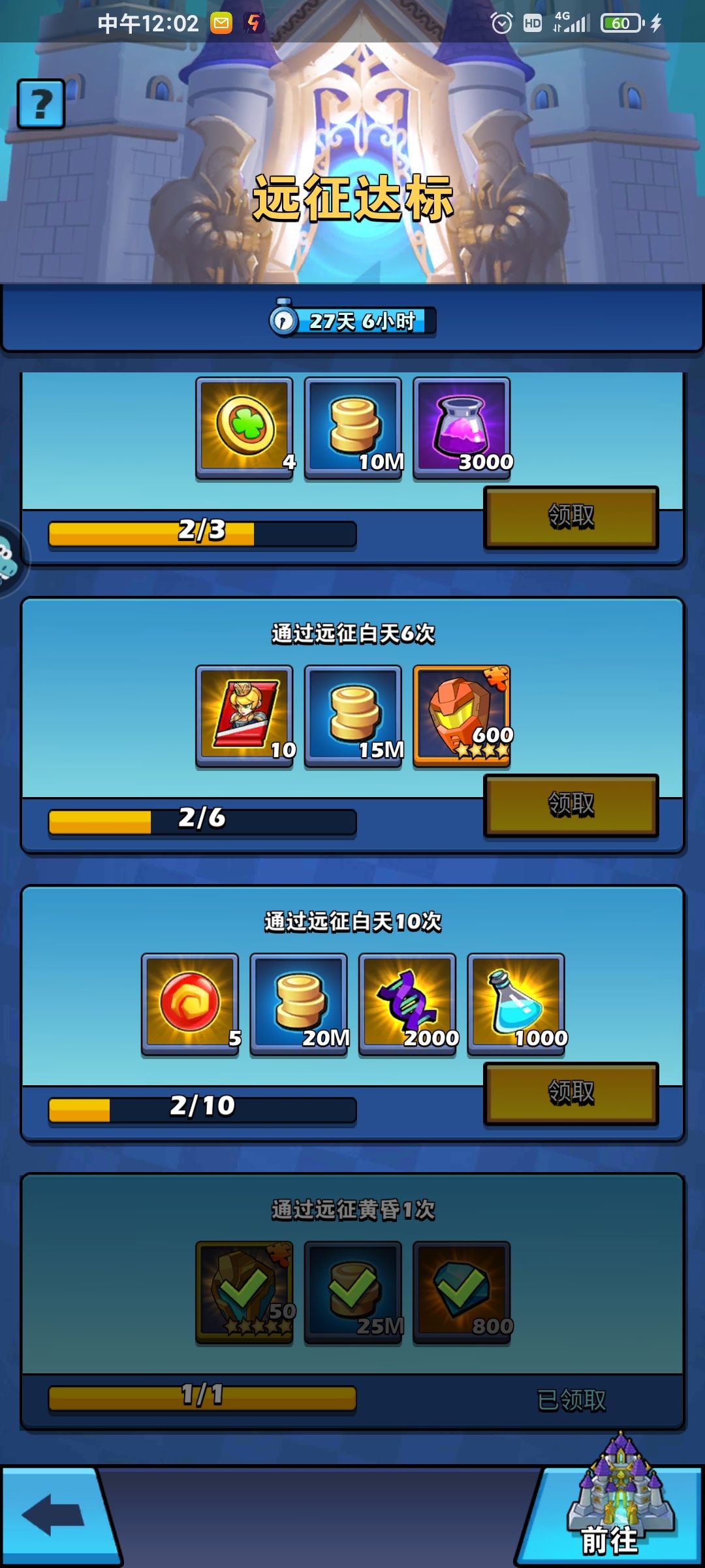 那这么多需要用到金币的地方,但是前期金币主要就只有挂机、秘境和试炼塔给,而且根本不够用,大量获得金币只有完成月度进化活动(这个主要看4星狗粮够不够,不推荐)和打通远征黑夜(25m金币,足够前期的挥霍了),那么黑夜打通就是我们需要解决的
