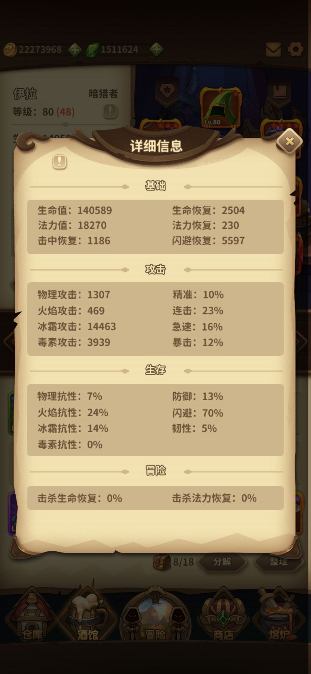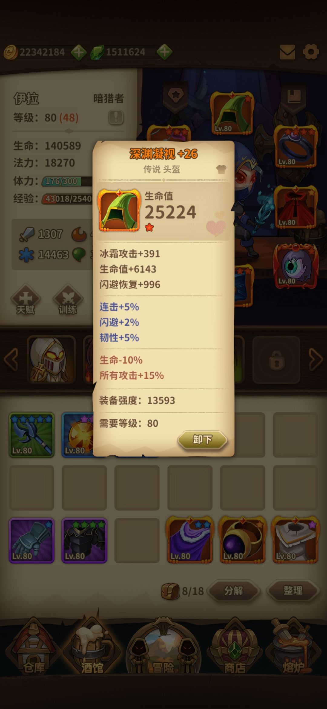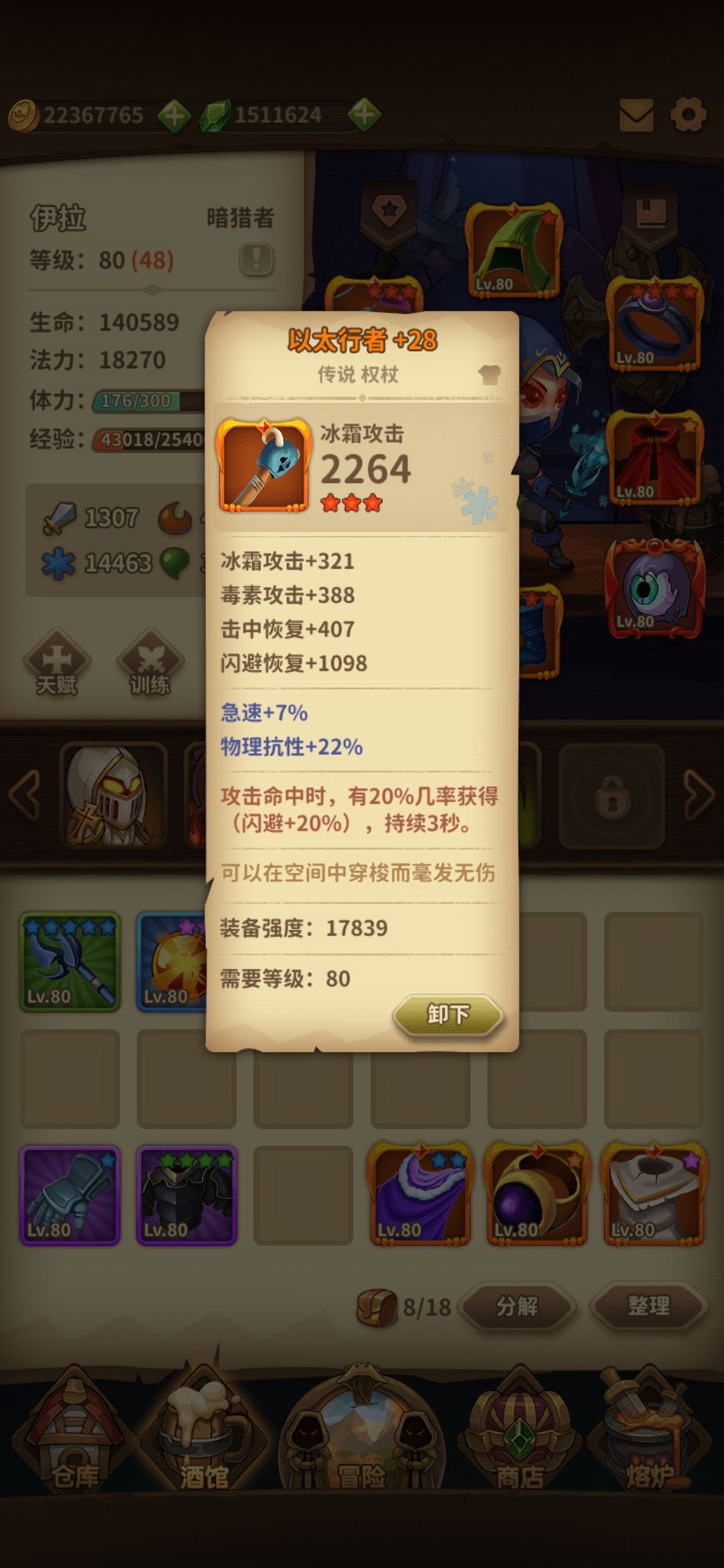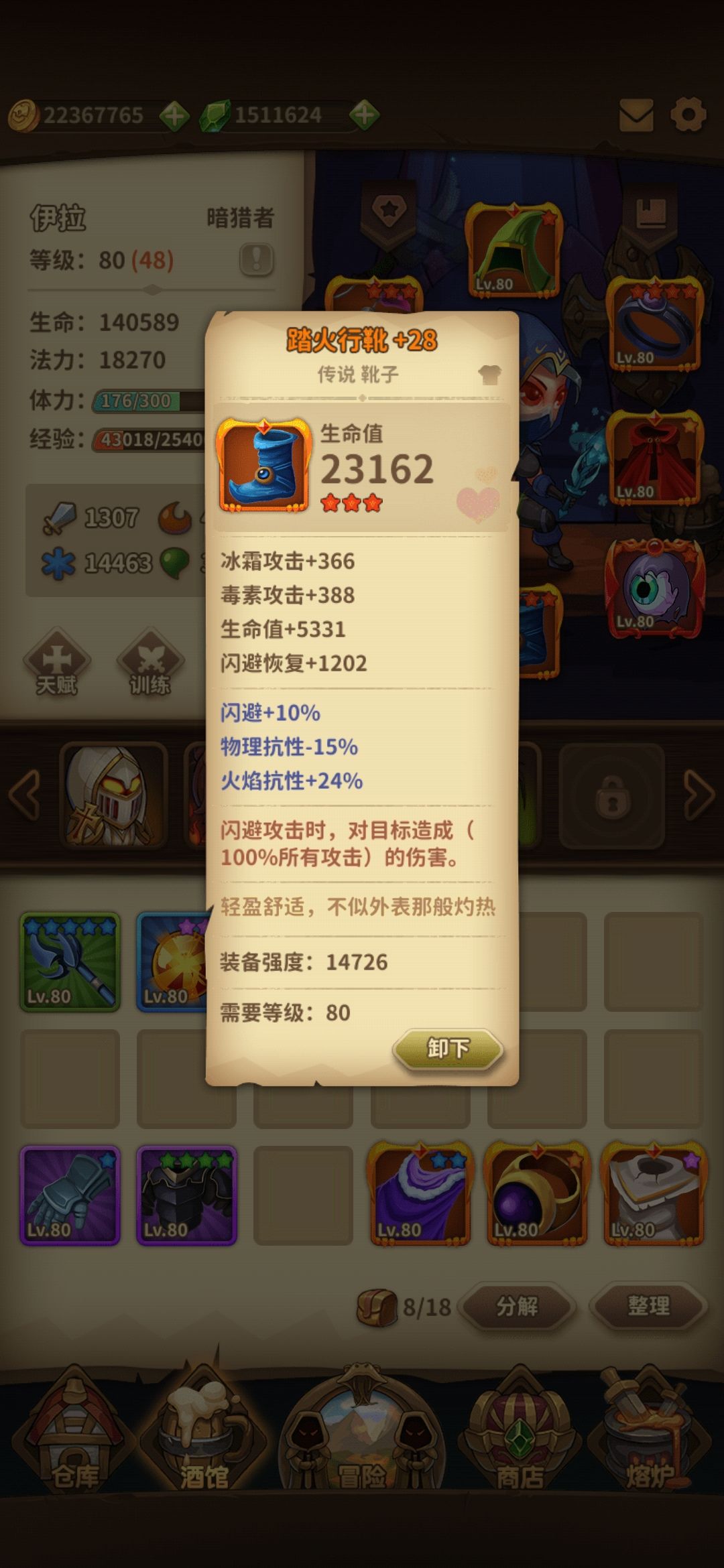 由于闪避最高率85,我也没有机会凑到所有装备去测试最优装备,目前70%闪避率,部分装备提供命中闪避,闪避后闪避,可以撑到85最大值,结合暗猎者闪避技能后,剩下的就看脸吃饭了。