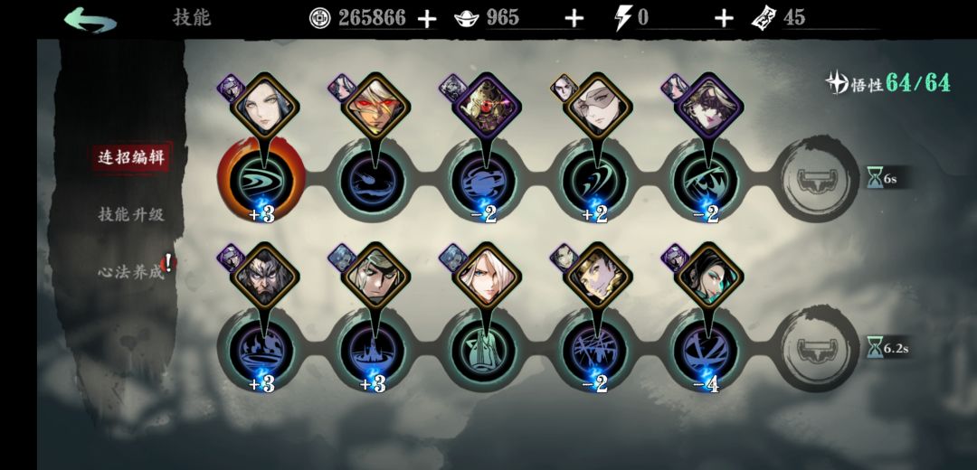 满级提升点补充1 注意心法和对应技能的绑定,例如芳华是减少技能CD,尽量放到CD时间长的技能上(觉醒技),会减少的技能时常比较多,技能链的总CD是所有技能的CD和,这样能最大化整条技能链的CD。其他的攻击效果加成最高的的放到主输出,破甲和眩晕尽量放起手技能,比较特殊的是暗夜飘香技能关联技能会额外多一火,可以考虑到火的收支搭配里。还有永明之志在三技能开之前必须要放到不消耗杀意的技能上才能眩晕。