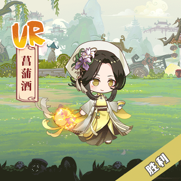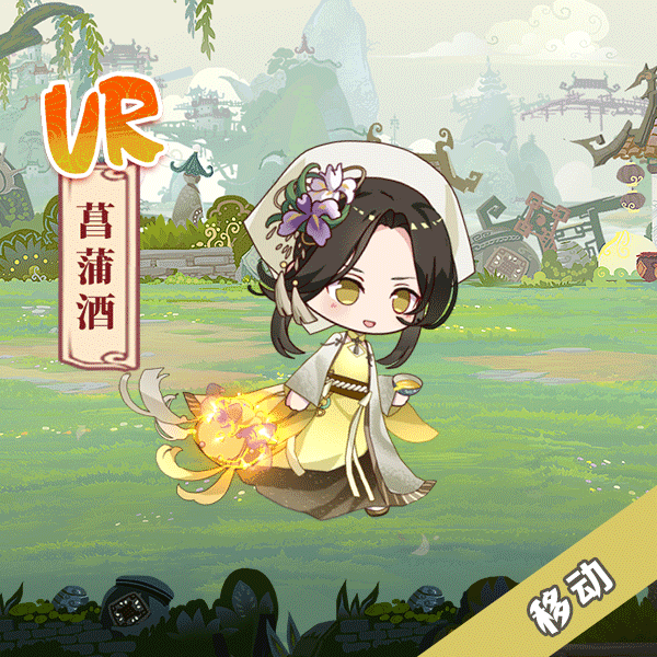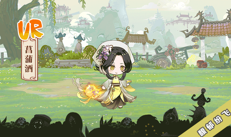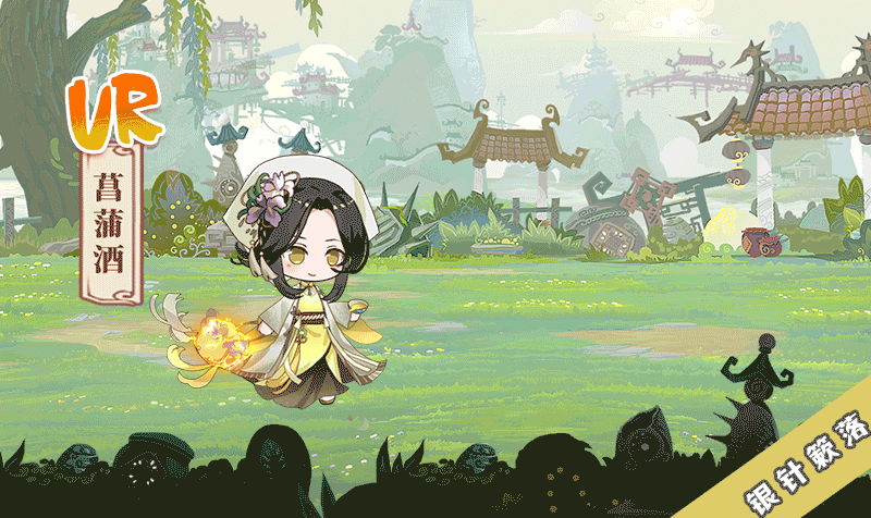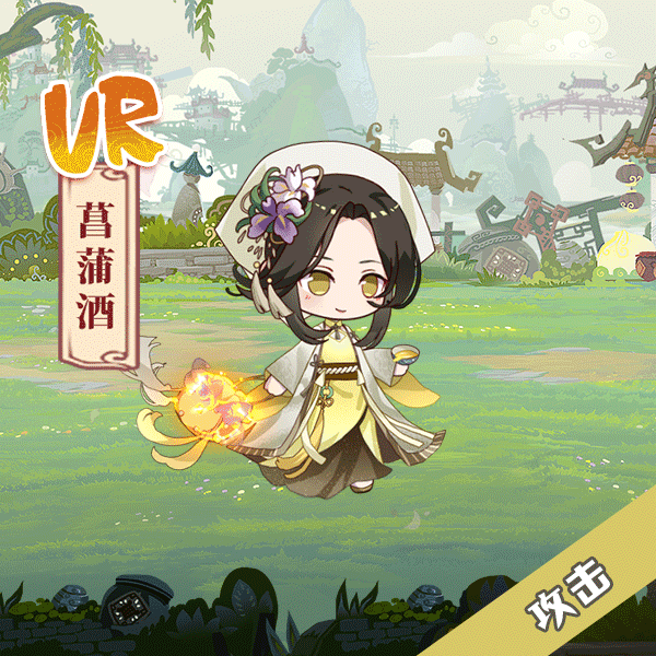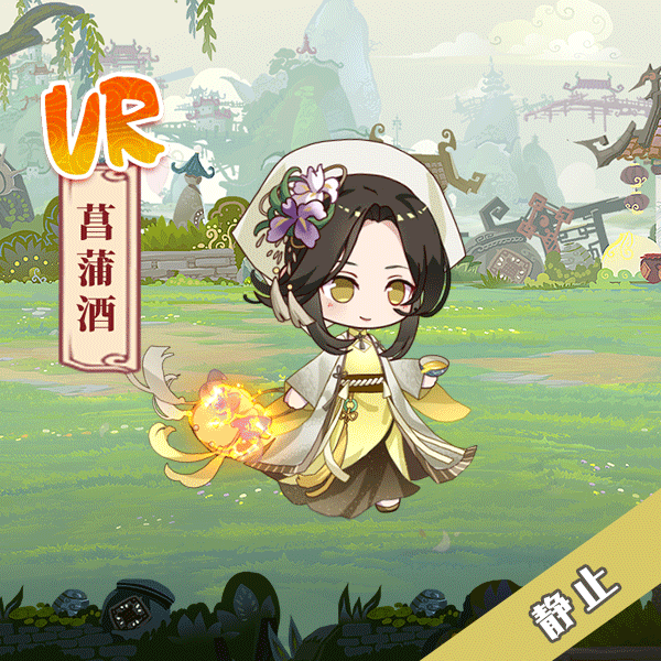 菖蒲酒主要采用了九节菖蒲这种名贵中药材,菖蒲为水生植物,可以看到飨灵卡面背景为水边,在飨灵头上戴着菖蒲花,以及服饰花纹也是菖蒲的纹路~