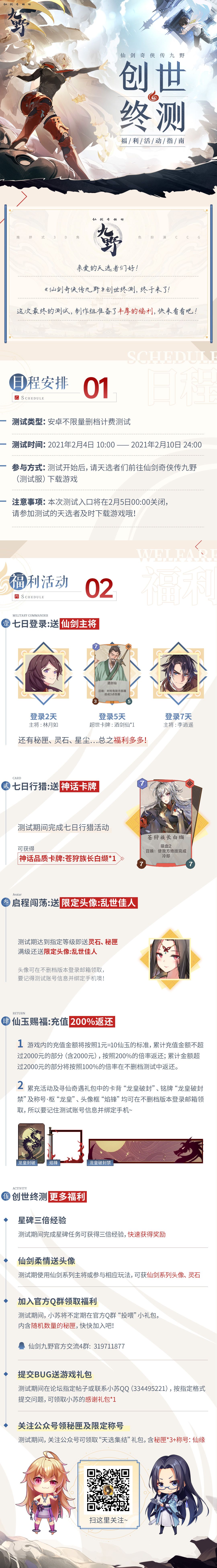13、其它功能:签到、问卷、活动、礼物(邮件)、设置等功能。以上就是本次创世终测开放的全部游戏内容,除此之外还会有超——多丰厚的福利,例如登录送仙剑系列主将和超世品质卡牌、完成活动送神话品质卡牌苍狩族长白缬、达到三十级领头像(可带到不删档测试账号中)等等。详细活动和福利请浏览下方长图吧~