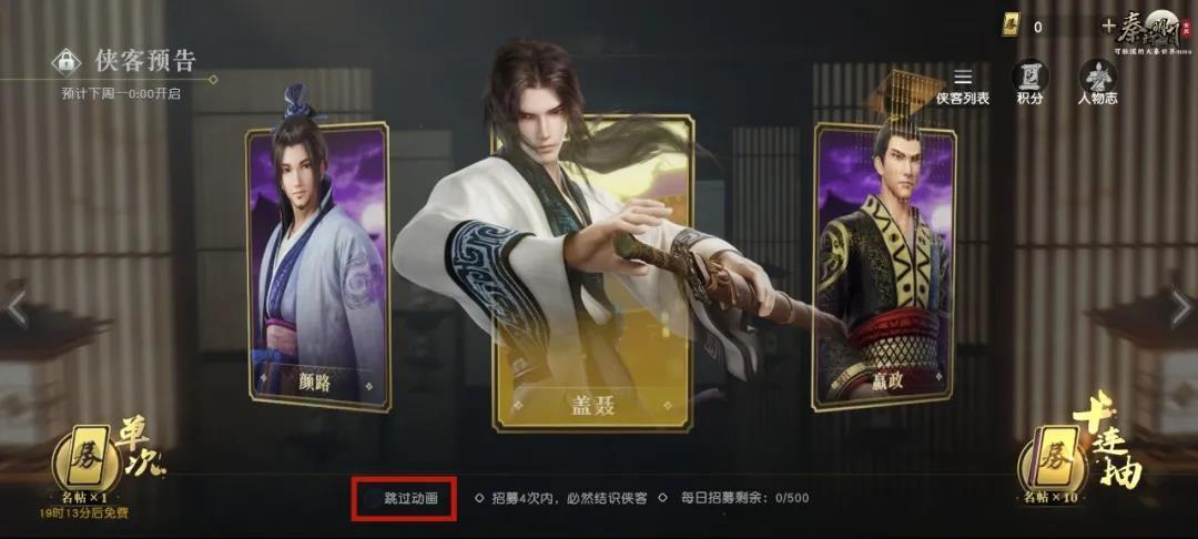招募界面的侠客改为单人展示,并根据金色、紫色等不同颜色区分其稀有度。还新增了人物志入口和自行选择是否跳过动画的按钮,当选择跳过动画后再进行侠客招募时将直接跳过动画播放,提升少侠们的游戏体验。