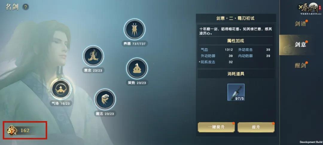 在剑意界面的左下角,增加了战力数值显示,UI样式和排版也同步优化,将文字字号缩小,重点内容变色突出,呈现出了更好的视觉效果。