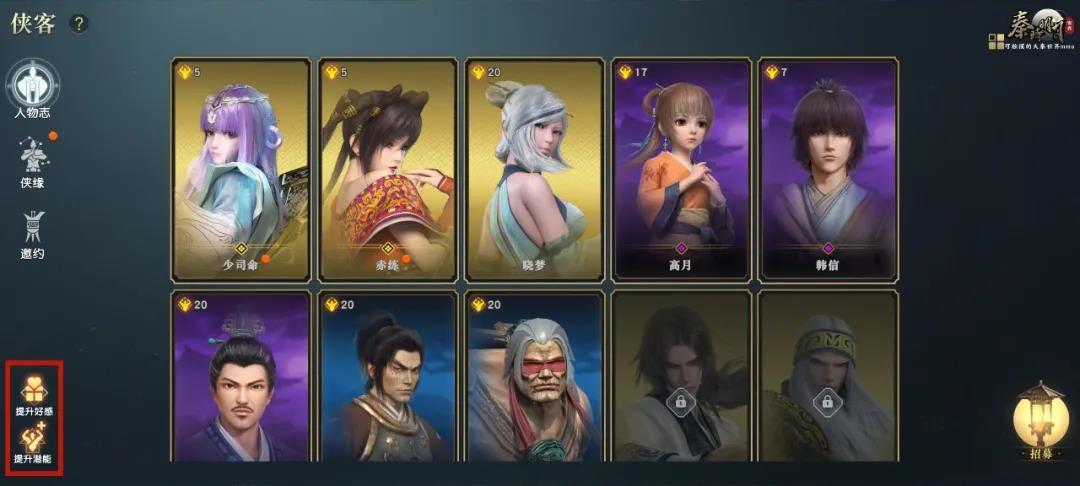 相比之前纯文字形式的UI按钮,现在侠客玩法界面的UI样式更加简洁美观。如邀约的按钮样式改为了符合秦朝与友人相邀举杯畅饮的“尊”,同时还加入了招募、提升好感、提升潜能等按钮,样式精致,功能实用。少侠们点击提升好感/潜能按钮可一键送出好感礼物/提升所有人物潜能,不用再逐个去进行培养。