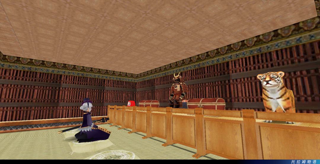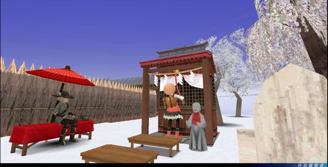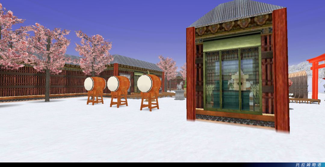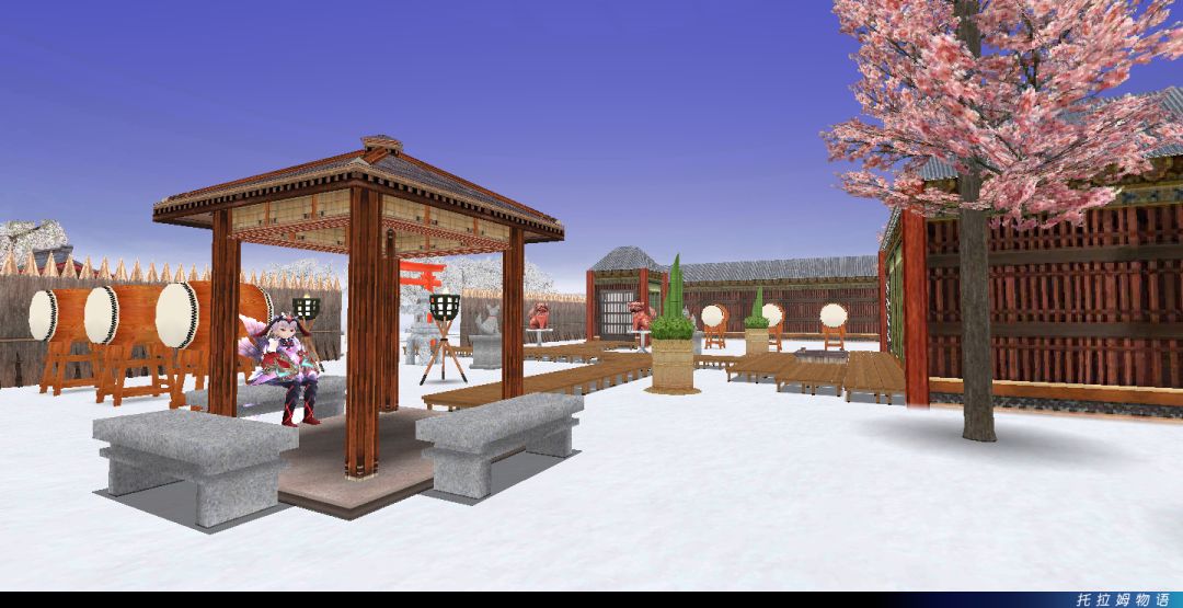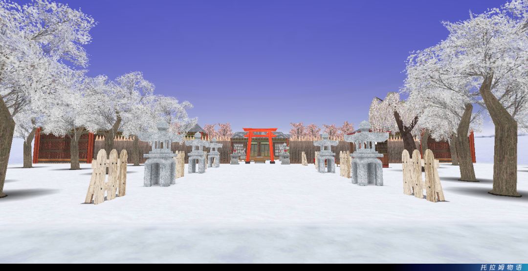 首先是外围,扩建后由于场地关系,只保留了正面的树林(背面的露天茶铺删掉了qwq)。由于删掉侧面和背面树林多出了许多家具数,所以把正面入口原本用作隔断的房屋改成了栅栏和鸟居