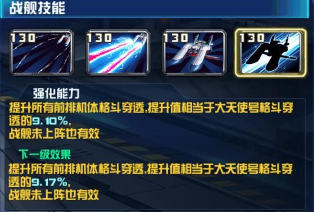 提升所有前排机体格斗穿透,提升值相当于大天使号格斗穿透的9.10%