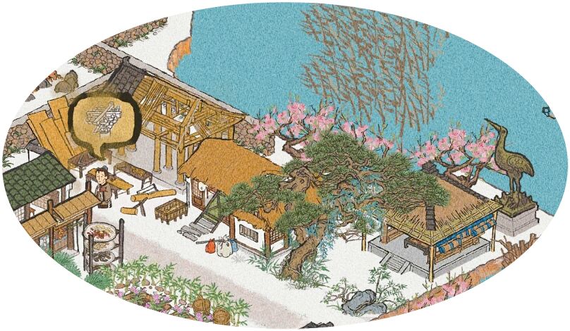 不待几人追问,子畏一指道旁双层草屋,言是寒舍「桃花庵」,又吟一《桃花庵歌》。众咋舌称颂,果忘询其人。子畏惜吾等舟车劳顿,提议庵中稍作歇息,然诸位游兴未艾,赏咏庵歌,再度前进。