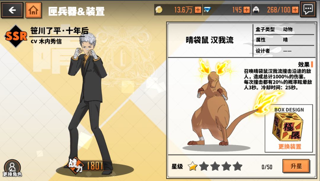 同时十年后笹川了平专属SSR匣兵器——汉我流也将上线,使用匣兵器后将召唤晴袋鼠汉我流撞击沿途的敌人并造成伤害,还有几率眩晕敌人!