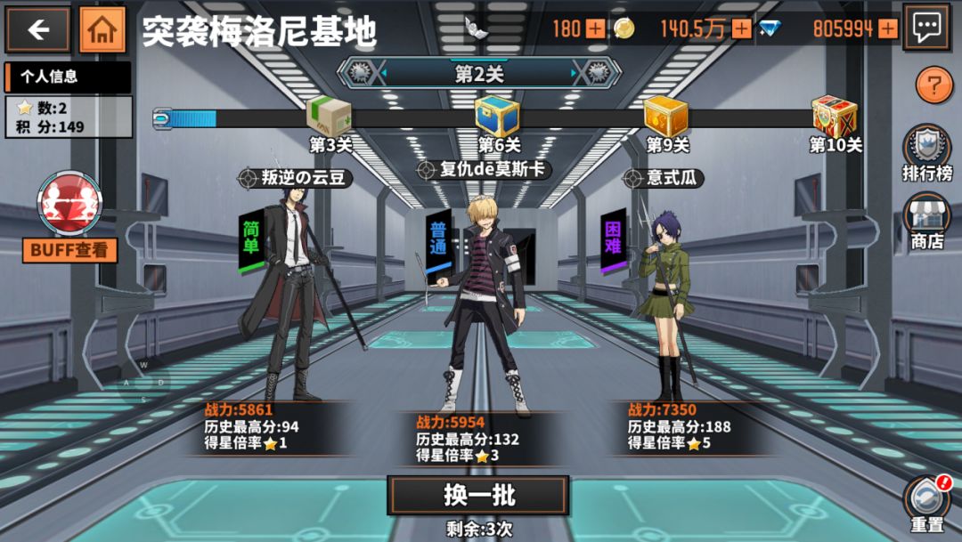 难度分为:简单、普通、困难三种,挑战不同难度可获得不同的星数及积分,选择难度后进入战斗,即锁定该难度,需战败对手后进入下一关。