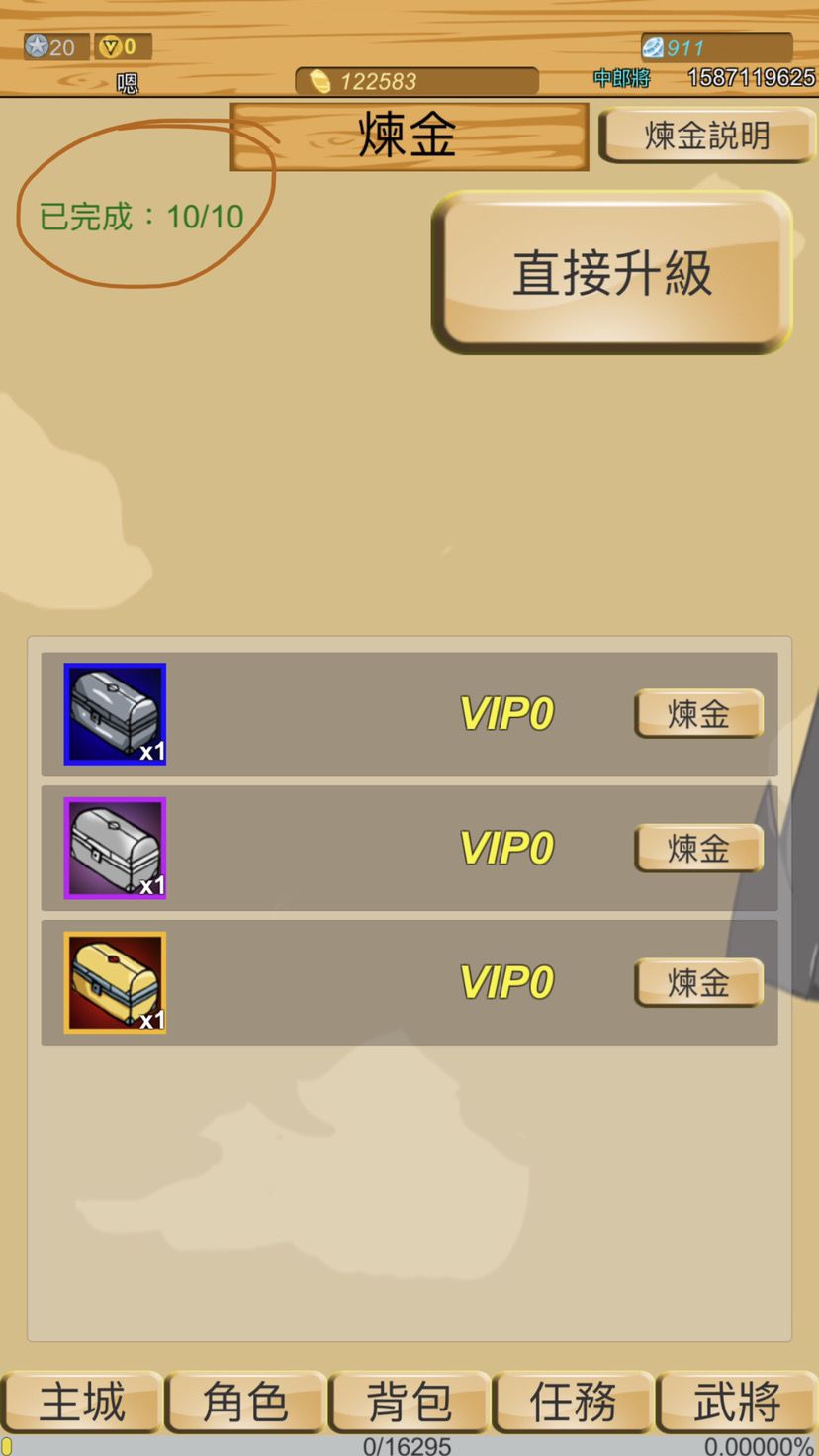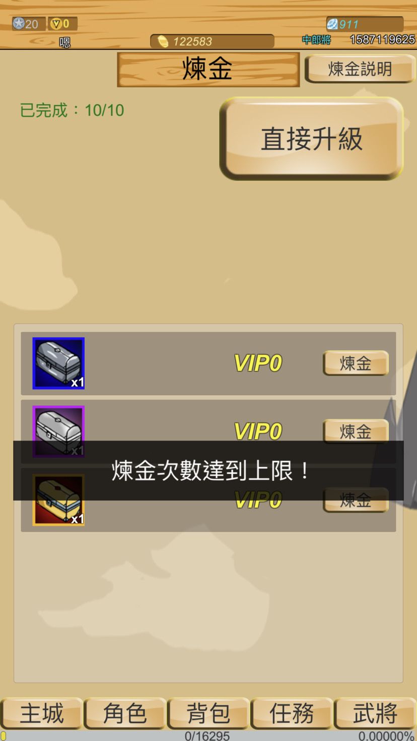煉金的金寶箱最低刷到第九次也要VIP1當然如果你要拿到金寶箱但你只有VIP1的話,第十次就一定要停了不然⋯⋯⋯