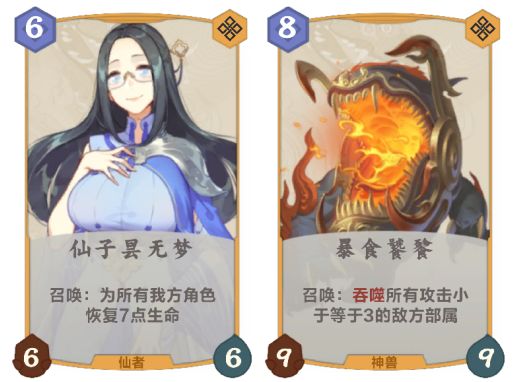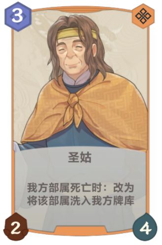 除了灵力消耗高这点,只有召唤时才能随机召唤一个敌方部属的复制,稍稍有点心痛;但没关系,我们还有圣姑,不要看圣姑老,但是能力可不弱,只要她在场,其他部署就没有后顾之忧,大不了圣妈把自己放回牌库再来一次嘛,对只有召唤时才有卡牌效果的牌简直不能再友好了,小苏愿意称之为亲妈!