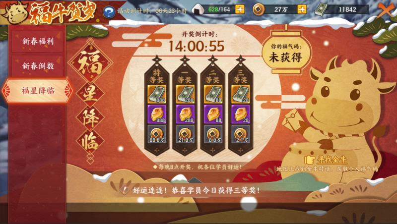 2、 每天20点前在地图上找到金牛,并完成任务,即可获得1个福气码;