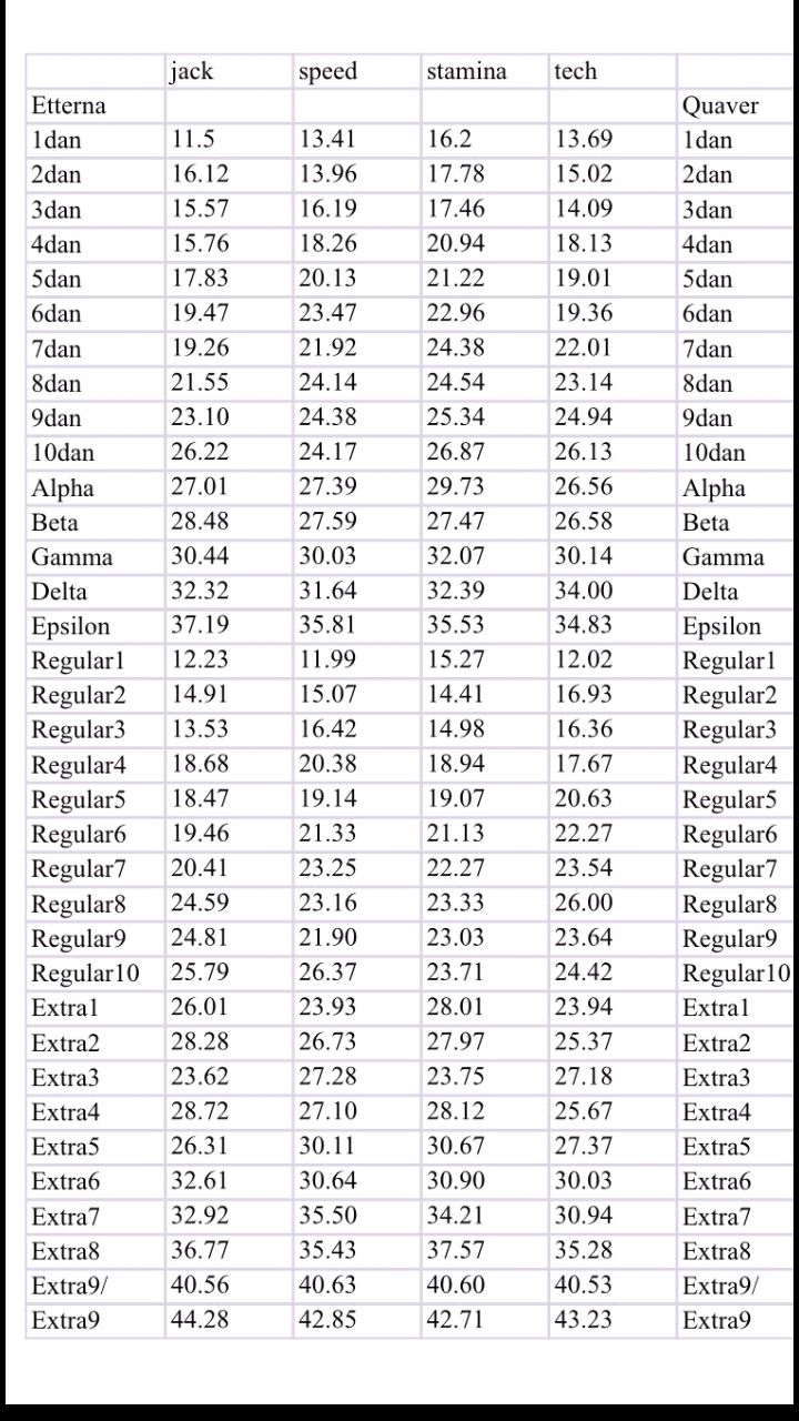 ps:图一里regular段位不是以jack等键型排列的,而是段位内歌曲的先后顺序(1→2→3→Boss),有些段位难度会和实际打的有较大差距(如ex3),最好不要以这个为完全参考