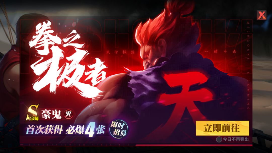 拳之极者,以武求道!《街霸:对决》S宗师豪鬼限时招募活动正在火热进行中,1月29日05:00至2月5日05:00,大家参与限时招募,即有机会获得这位全新格斗家。招募期间,首次获得必爆4张!