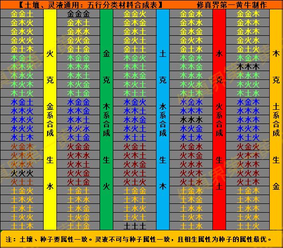 (注:黑色字体标出了五种五行中相同的合成材料)
