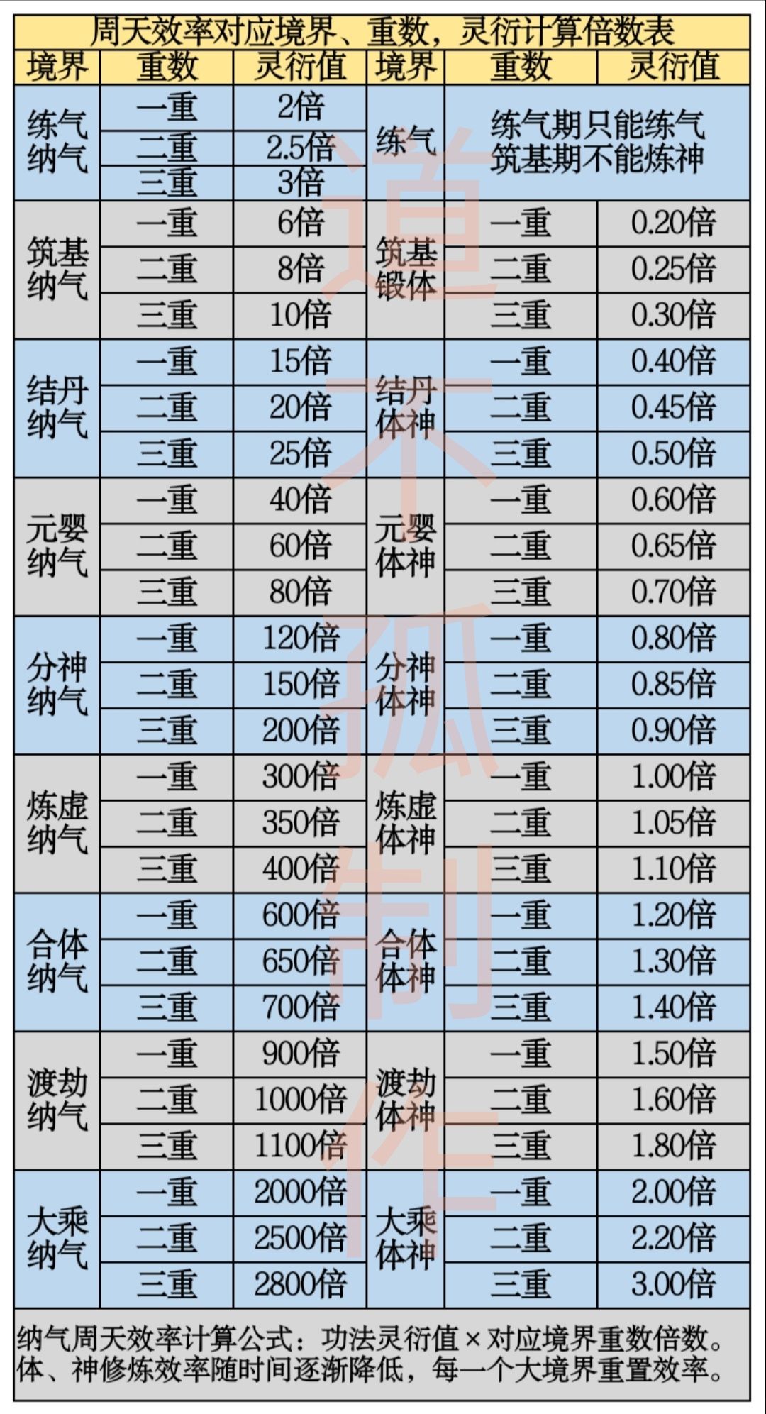 (注:表格采取每个小阶的极致数9进行计算:玄中1.49、玄上1.59…,算出的值是在外部修炼环境圆满且不包含经脉加成的理想值,并非实际获取灵气值)