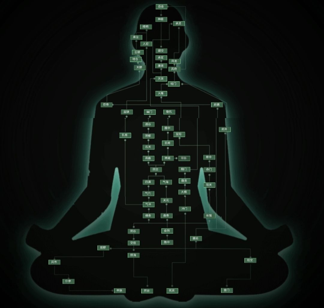 此图由奇经八脉中的一个个穴位组成,对应八脉一个不少,按顺序点击即可连成顺序的线路。练气期功法是最低级的且穴位为八个,境界每升一级,穴位就加一。