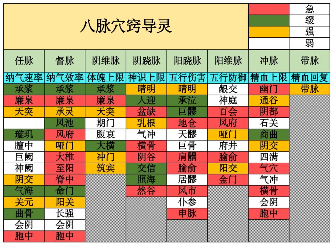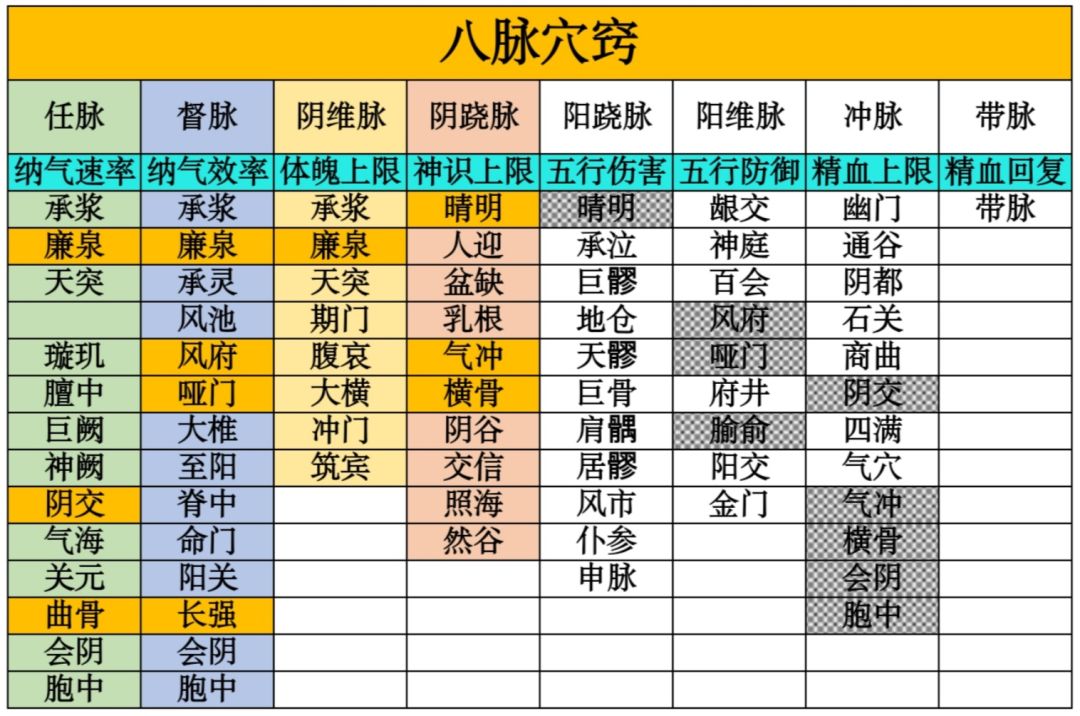 看图,八列对应八脉,青色第三行则为每一脉在人体的对应作用。穴位自上而下按人体脉络顺序排列。(黄色格子是脉络分节点,灰色马赛克格子是重叠穴位)