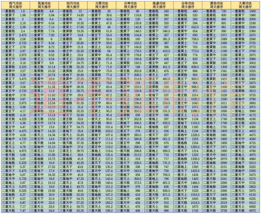 ①、由表可知,上一境界的功法即使品阶和重数再高,到了下一境界也不过相当于黄阶、玄阶一重左右的水平值。所以升境界必要换功法,不要一个高阶功法用两个大境界了。