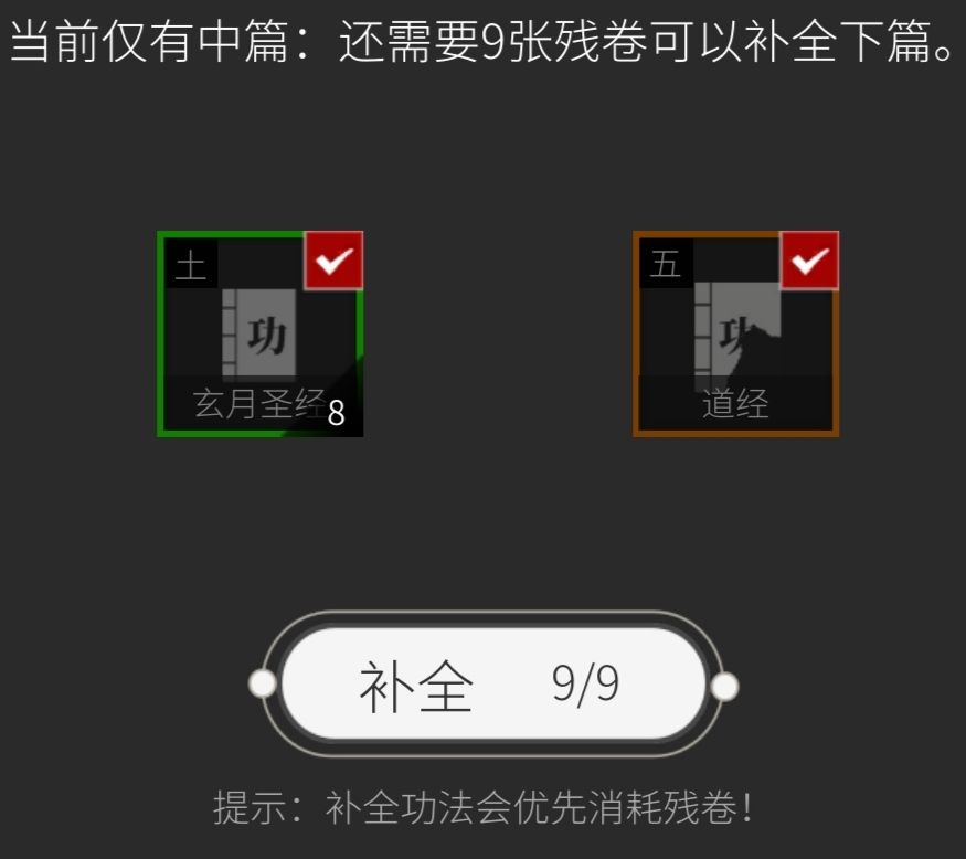 即:学会一门功法后,用残卷或相同功法进行补齐,得以提升重数。(主界面下的参悟界面,点开自己的功法)
