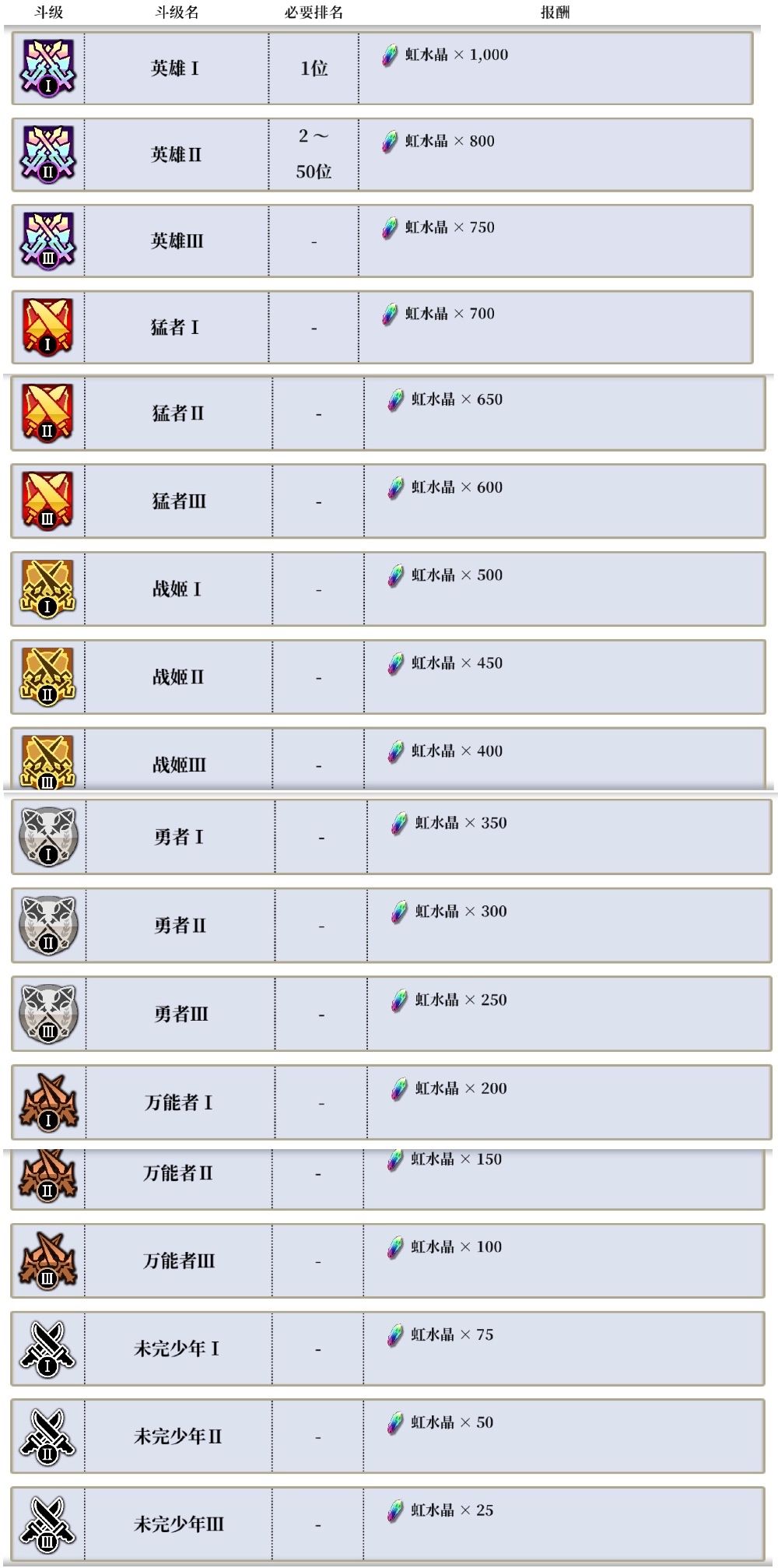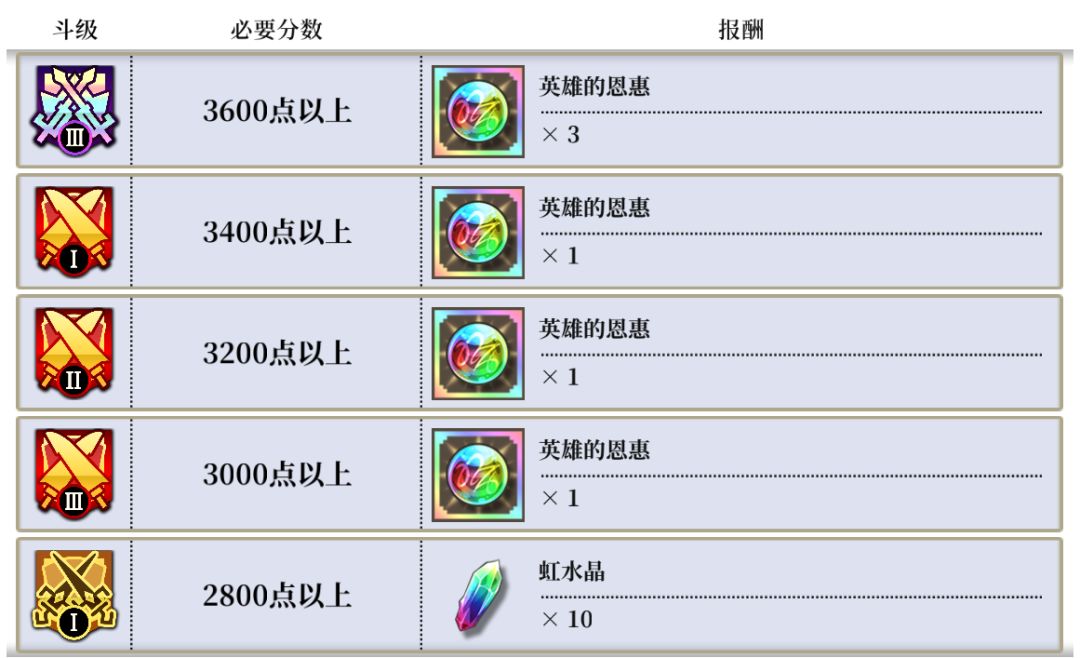 第一种【升级报酬】是指玩家对战获得积分,随着斗级的提升即可获得相对应的积分奖励,达到猛者段位以上即可获得英雄的恩惠,而在该段位以下的每一级都是10枚虹水晶奖励。