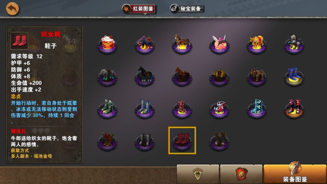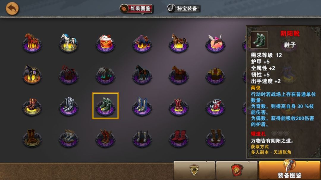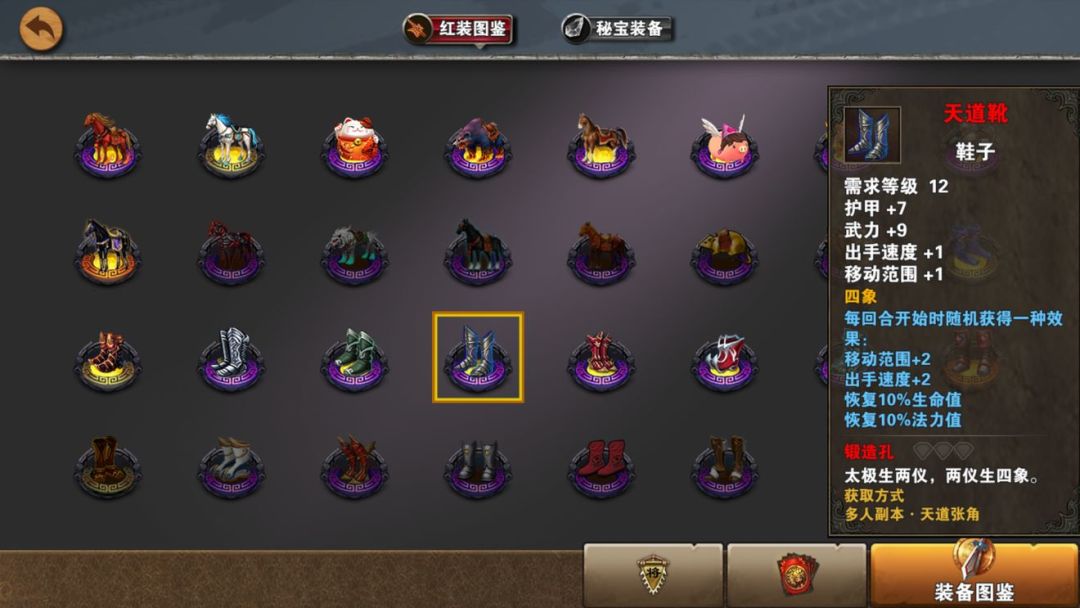 基础属性较弱,特效随机不太好把握。值得使用的是回蓝,在汉中打诸葛,动则几十回合中,蓝很快就耗尽了,拿去给夏侯续航用用。其他地方,貌似没有特别的作用。不知道缺德破魂甘宁穿天道是否有意义。天道鞋有没有可以随缘,拿到了留一双,说不定以后会用呢。
