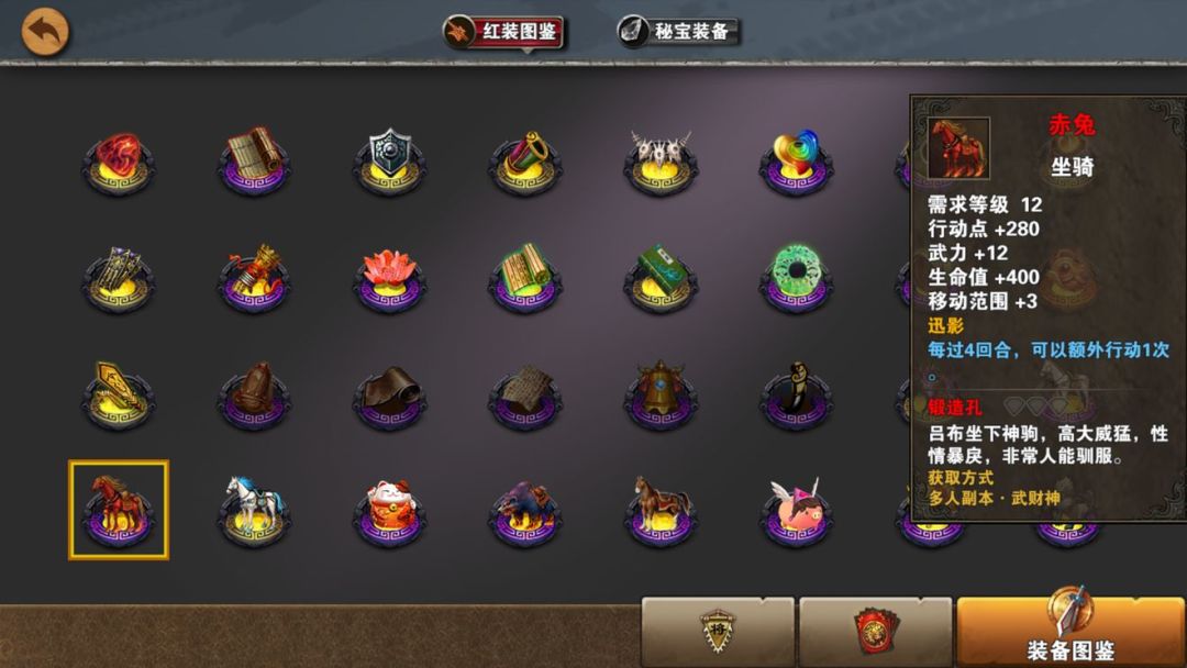 马中赤兔,武力血量双高坐骑,还带一个讯影四回合双动。这马给武将使用挺不错,属性血量适用竞技场和推图,特效也很好用。竞技场的套路中,用4回合赤兔双动做一个爆发点秒英雄翻盘打爆五色是必备的竞技场基础常识了。