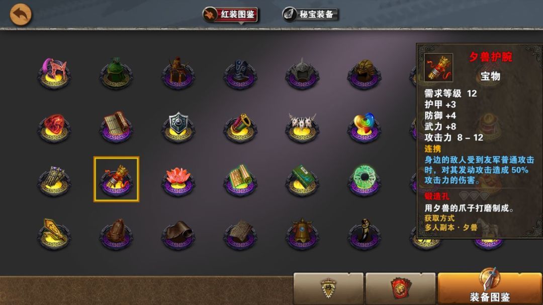 夕兽护腕--甲3防4武8,攻8-12。特效连携,身边的敌人受到普通攻击时,对其发动50%攻击力的连携伤害。