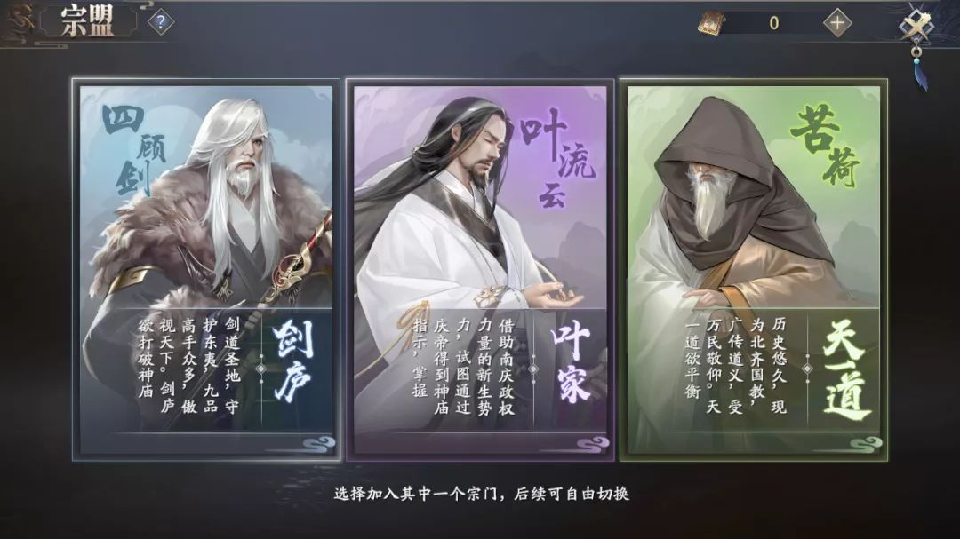 在游戏内的宗盟系统开启后,少侠们可以选择加入叶流云、苦荷或四顾剑的宗盟,结识其它志同道合的伙伴共闯江湖。