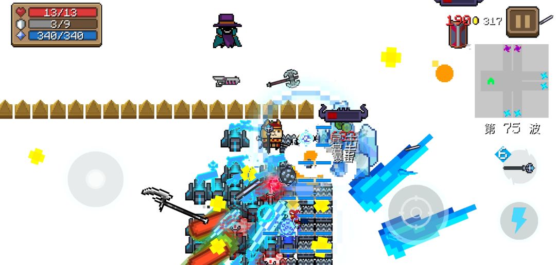 我用的精致法杖,多放几个增幅器,放在一起或者说两侧也放一点,使劲按攻击键,然后再增幅器旁边走来走去,武器攻击范围就会越来越大,不一会就比地图还大了,攻击力也随之翻倍,当然也要不断升级武器,最后武器都是两三百级了,不然真防不住。掩体也要放几层,主要防Boss,次要防小怪(大部分小怪一出生就死了),而且因为有了精致法杖,我可以在刷新小怪的时候冒险去捡材料,一般都不会受到什么伤害,但是后面的小怪打人是真的疼,近战打你一下二十多点都没有了,再打一下二十多点血没有了😱,远程我忘了……