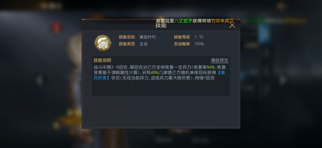 刘邦的二技能可以搭配上“周郎顾曲”,在对敌方造成不俗伤害的同时,还能随机降低敌方一名将领的伤害,该技能为非常强的AOE技能,能够不小地提升埃及艳后的谋略输出能力。三技能可以搭配上“战术打击”,准备一回合,对敌方单位发动五次谋略攻击伤害每次都会递增,如果自身兵力大于目标,则再次对目标发动谋略攻击。伊丽莎白的“黄金时代”,在战斗的第三到第六回合,每回合都能恢复己方兵力。三到六回合正好是战斗最激烈的时候,兵力损耗肯定会大幅上涨,所以该技能属性还是非常不错的。