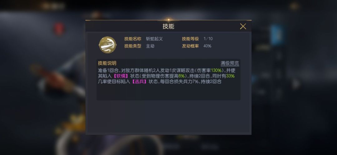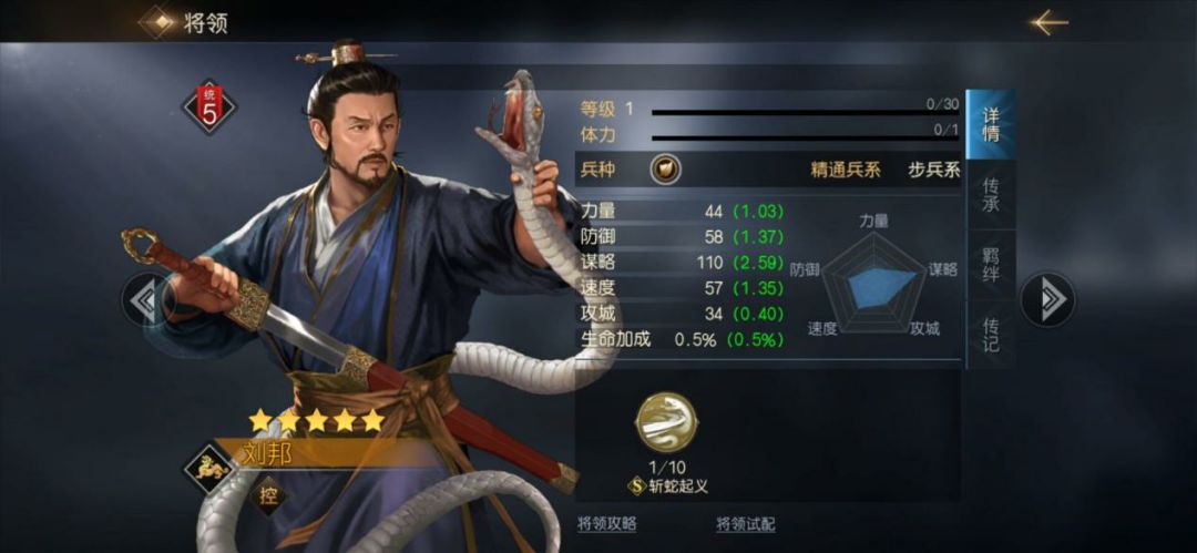 这三个将领组合在一起,使得阵容有着不错的坦度,在输出不俗的同时,持续作战能力也不错,可以说是一套非常实用的阵容。刘邦的技能“斩蛇起义”,作为强力的谋略技能。能够有几率使敌方进入“软糯”以及“逃兵”状态,使敌方每回合损失兵力。