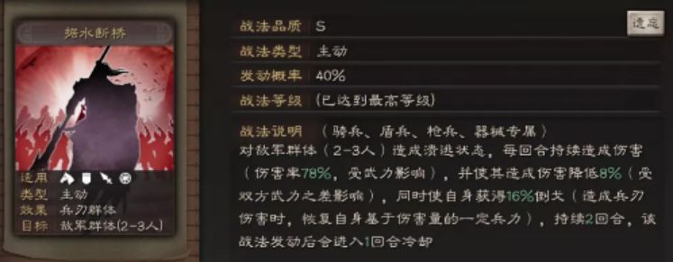 这个战法,非常之骚。如果大家玩过LOL或者王者,就知道乌鸦、芈月是为何这么肉的。据水断桥这个战法,也有点那味儿,不过是个兵刃输出的类型。这里给敌方2-3人上溃逃dot2回合,然后自己获得16%吸血(恕我直言,这里的进不进入1回合冷却,其实没差,毕竟绝大多数情况下,效果持续2回合不成问题)