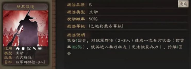 又一个50%的准备战法,携带着大量的兵刃伤害,以及禁疗效果。没记错的话,这样这个游戏就有四个禁疗了。另外三个是焚辎营垒、程昱、貂蝉。也就是说,这是唯一一个兵刃向的禁疗战法。