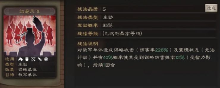 SP诸葛亮、SP周瑜的传承战法。纵兵劫掠+落雷的融合版本。看上去很美,实际上35%的发动几率还是有点面目可憎。不过35%几率换来如此强大的效果,可以说是非常超值了。