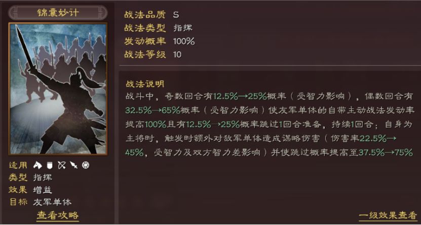 这么一看,是不是就清晰明了了。SP诸葛亮的厉害之处就在于他是使1个友军的自带主动战法“进化”,使其同时拥有主动战法的高上限、以及逼近指挥的稳定性,摇身一变成为超级战法。(但依然受限于友军被控)